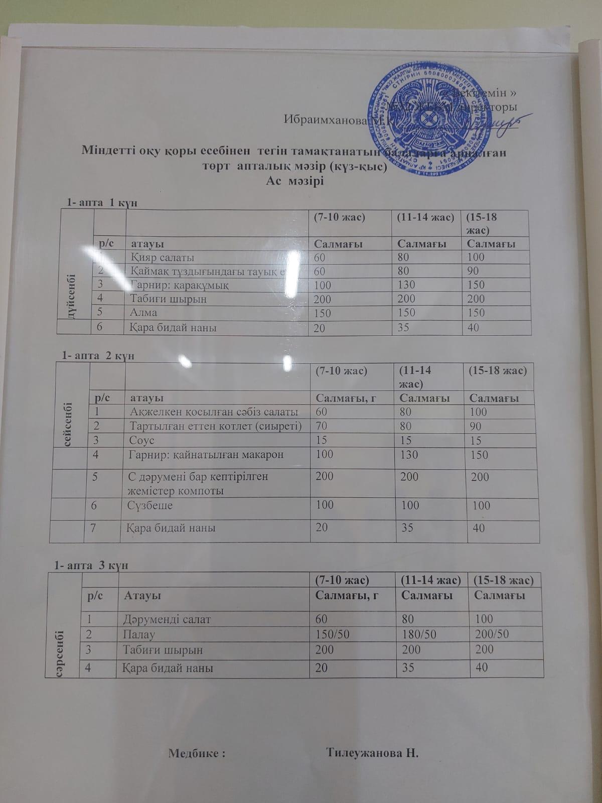 Тегін тамақтануға арналған ас мәзірі,Меню для бесплатного питания