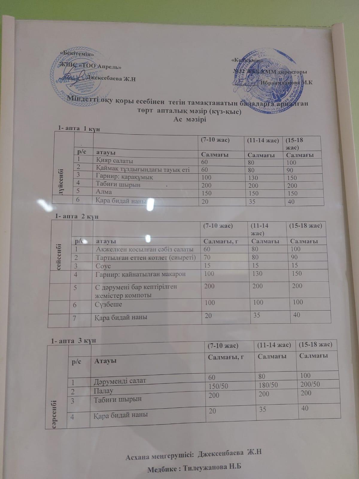 Тегін тамақтануға арналған ас мәзірі,Меню для бесплатного питания