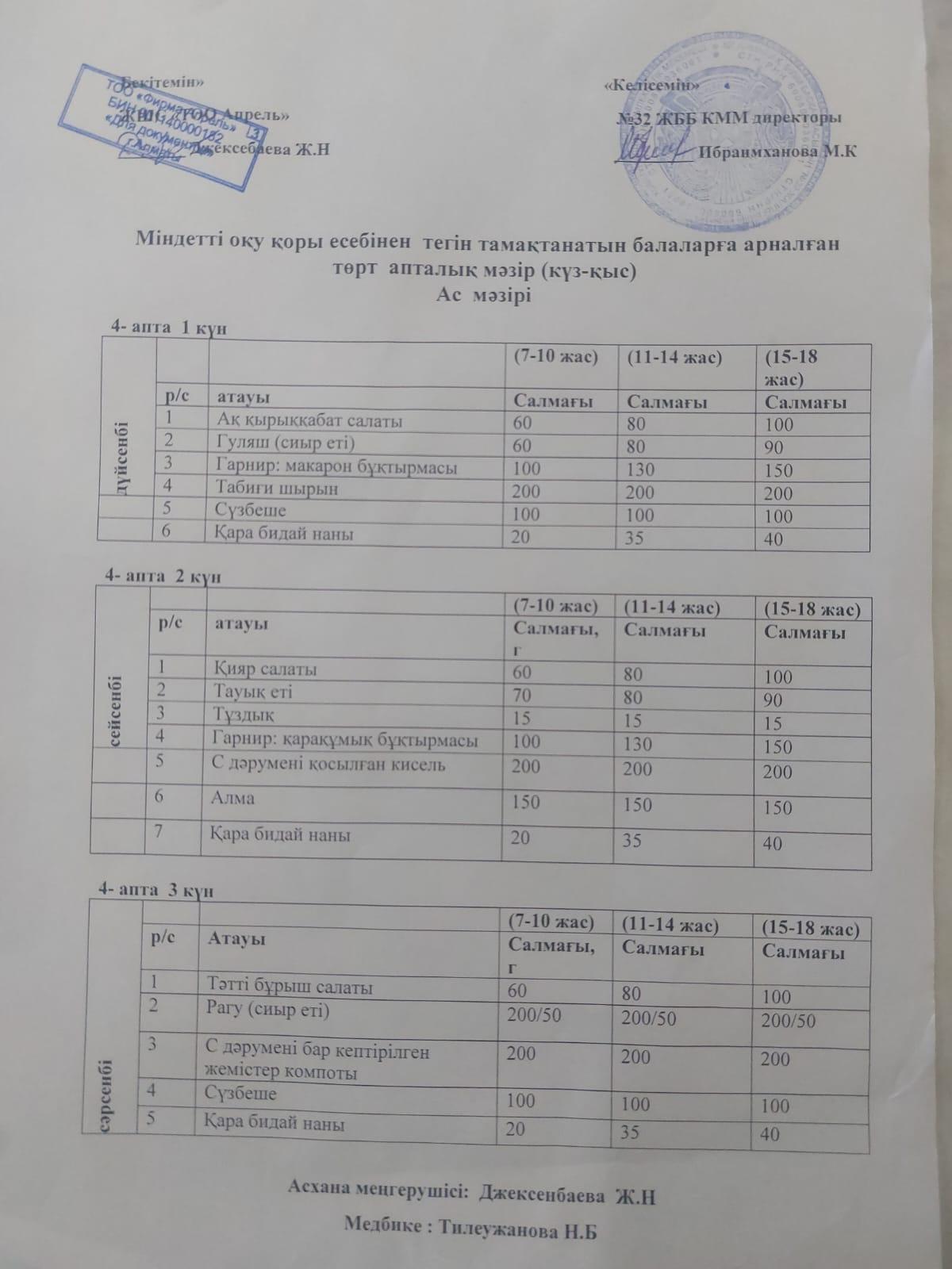 КММ №32ЖББМ-тің оқушыларға тегін тамақтануға арналған тағам мәзірі,4апта.Меню блюд для организаций бесплатного питания обучающихся В КГУ ОШ №32 4-неделя