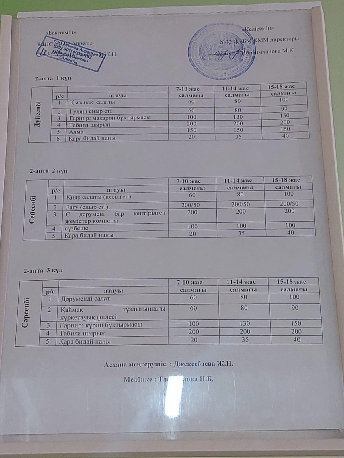 КММ №32ЖББМ-тің оқушыларға тегін тамақтануға арналған тағам мәзірі,4апта.Меню блюд для организаций бесплатного питания обучающихся В КГУ ОШ №32 4-неделя