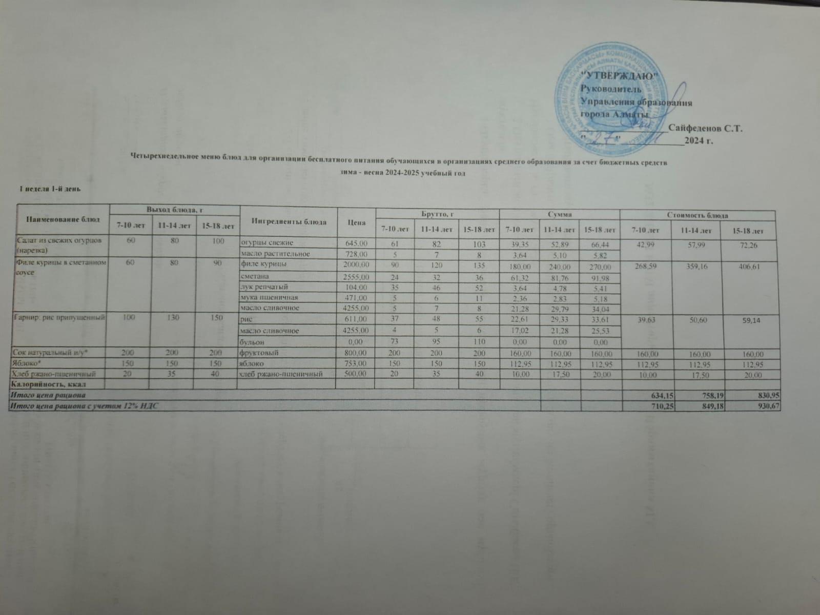 29 қараша 2024 0 1 2 3 4 5 Четырехнедельное меню блюд для организации бесплатного питания обучающихся в организациях среднего образования за счет бюджетных средств "зима-весна" 2024-2025 учебный год