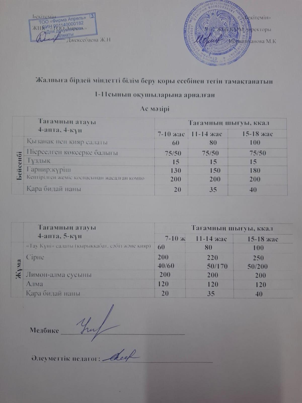 КММ №32ЖББМ-тің оқушыларға тегін тамақтануға арналған тағам мәзірі,4апта.Меню блюд для организаций бесплатного питания обучающихся В КГУ ОШ №32 4-неделя