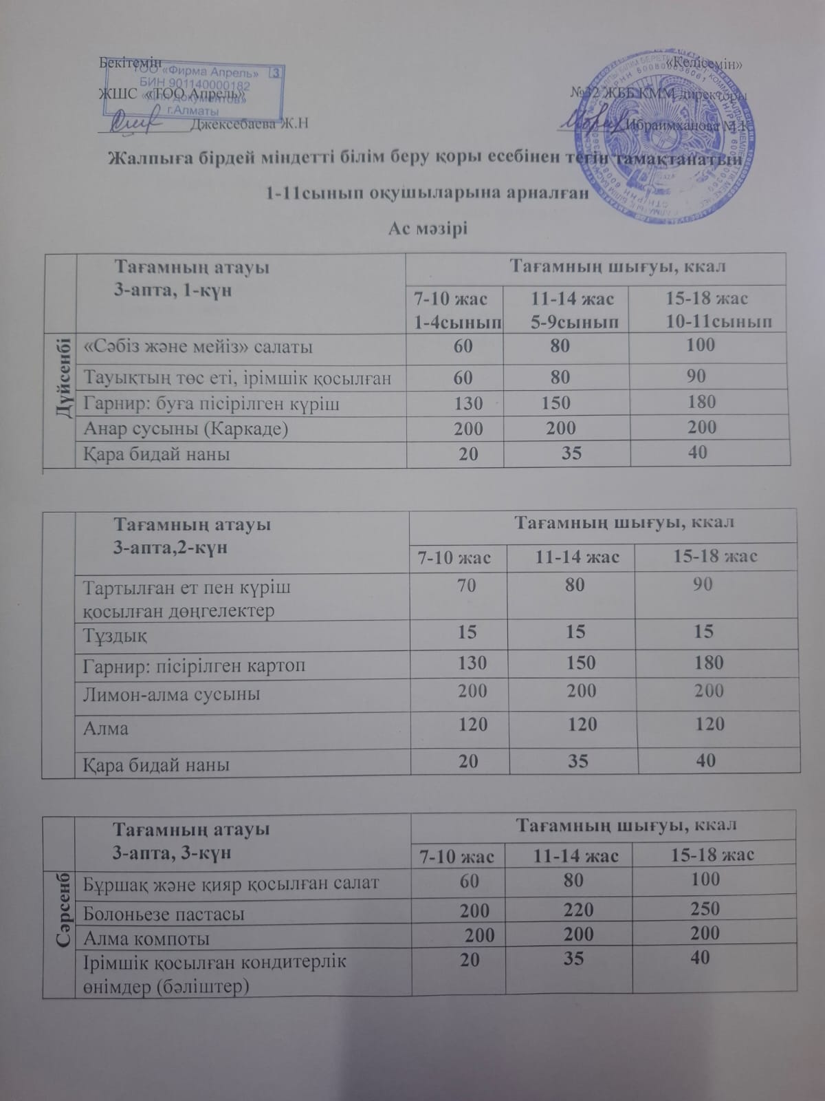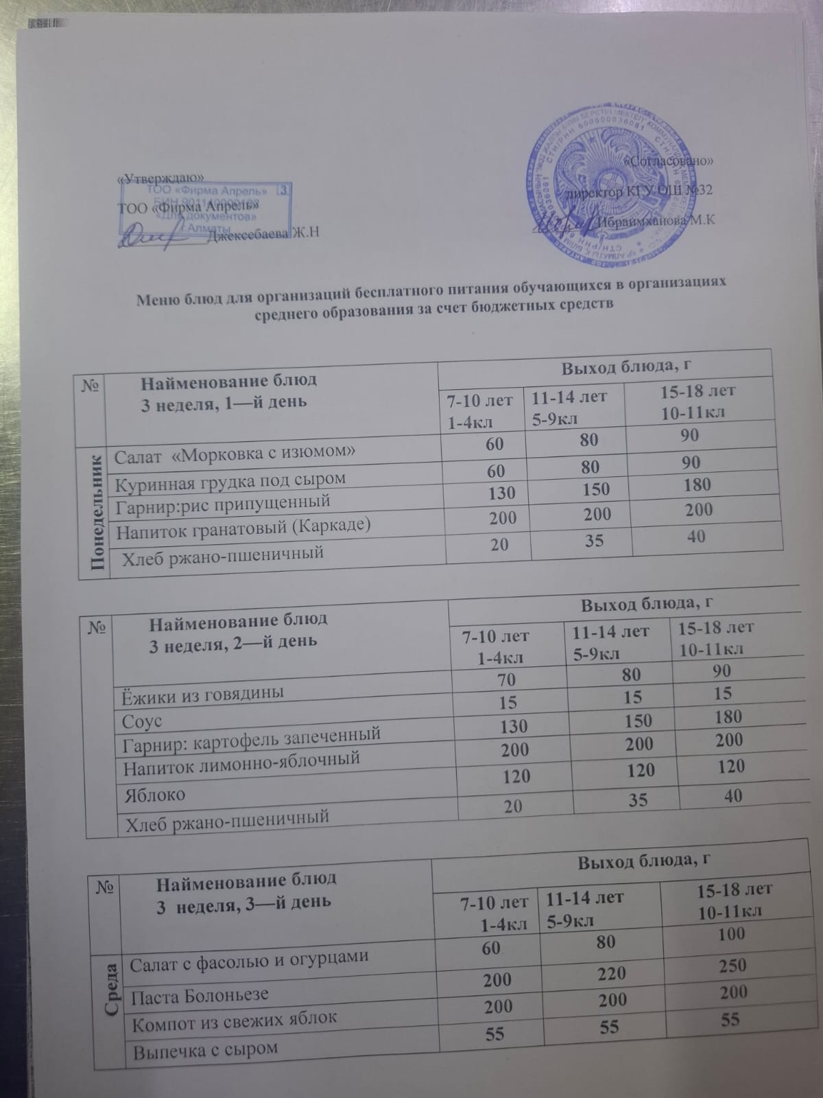 КММ №32ЖББМ-тің оқушыларға тегін тамақтануға арналған тағам мәзірі,4апта.Меню блюд для организаций бесплатного питания обучающихся В КГУ ОШ №32 4-неделя