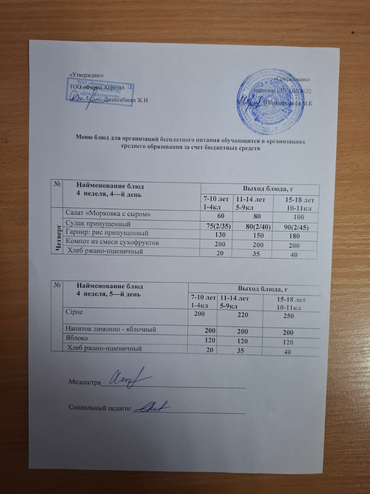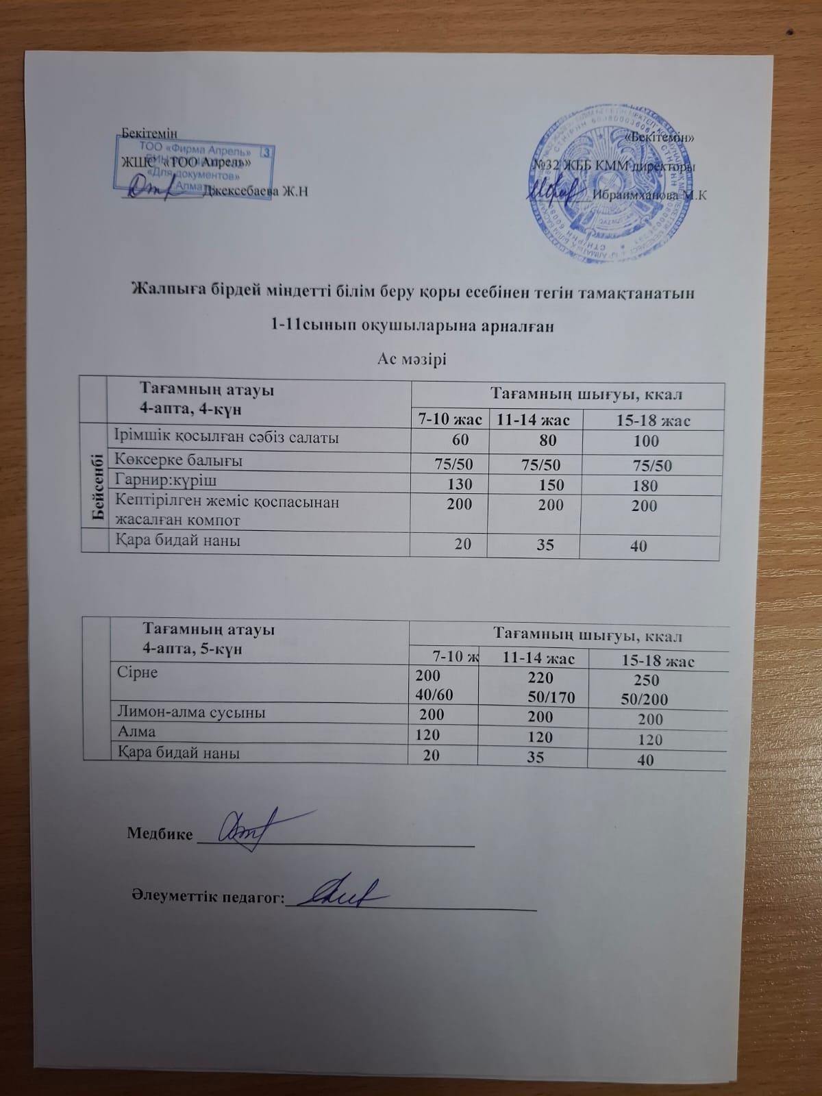 КММ №32ЖББМ-тің оқушыларға тегін тамақтануға арналған тағам мәзірі,4апта.Меню блюд для организаций бесплатного питания обучающихся В КГУ ОШ №32 4-неделя