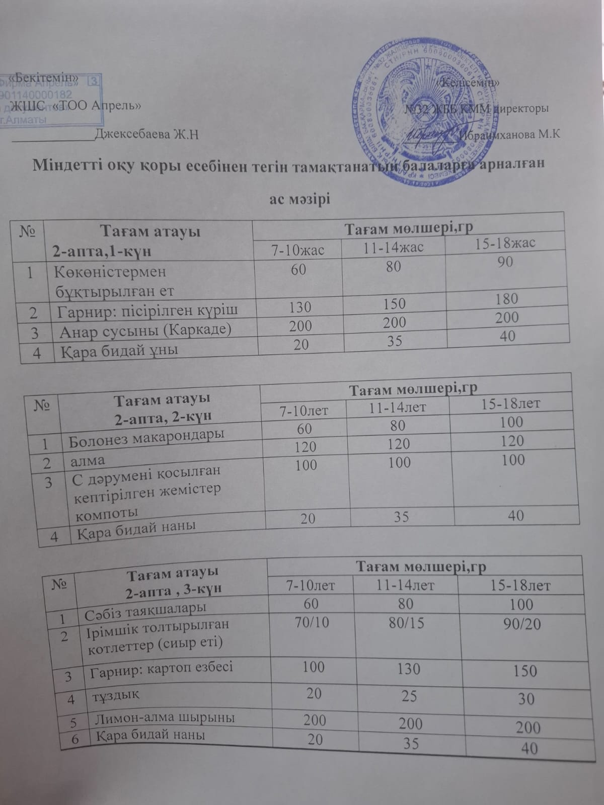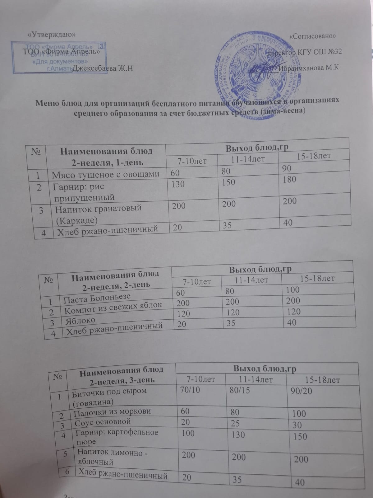 КММ №32ЖББМ-тің оқушыларға тегін тамақтануға арналған тағам мәзірі,4апта.Меню блюд для организаций бесплатного питания обучающихся В КГУ ОШ №32 4-неделя