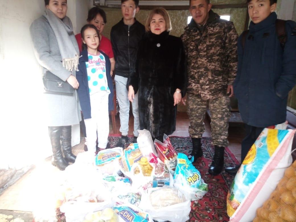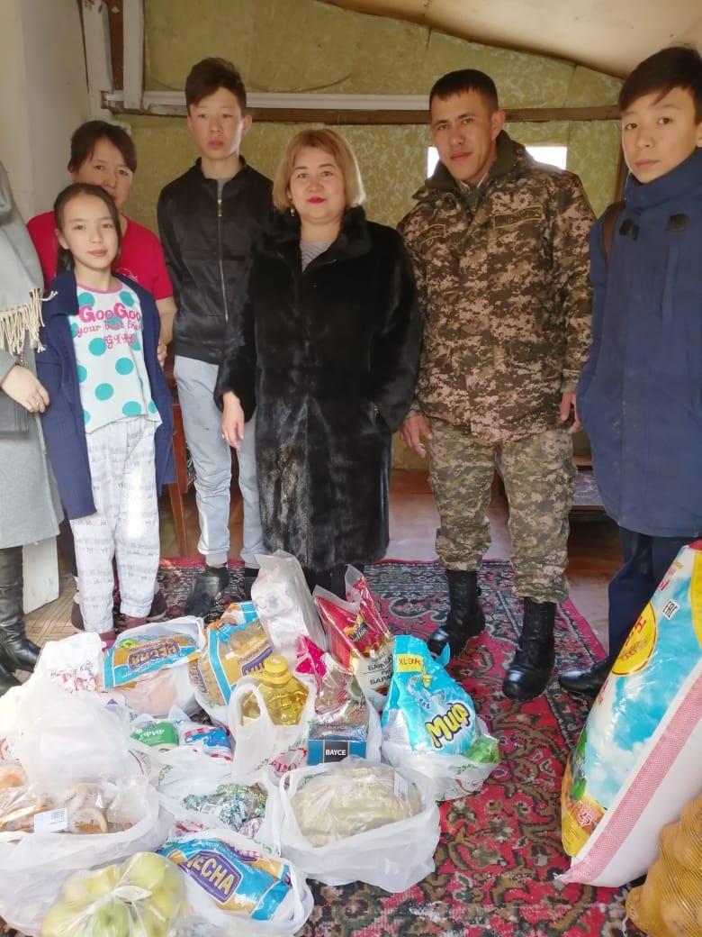29219 Ә/Б командирі подполковник А.Байыров және ұжымы 7-сынып Медетқызы Ақжүніс отбасына, қайырымдылық қорына тамақтай және10 мың теңге ақшалай көмек берді. / В/ч 29219 командир подполковник Байыров А. и его команда помагали в семье Медетқызы Ақжүніс