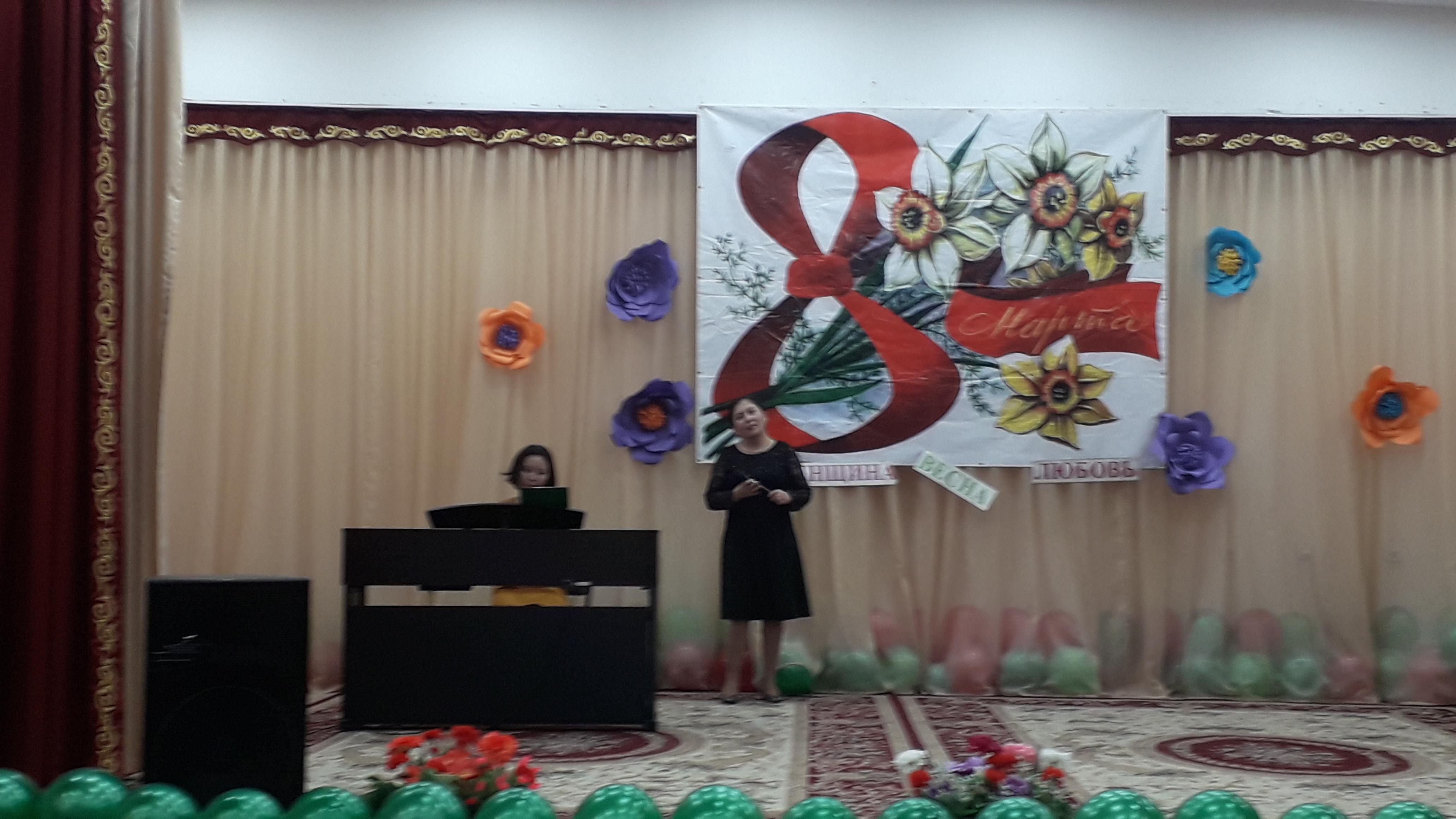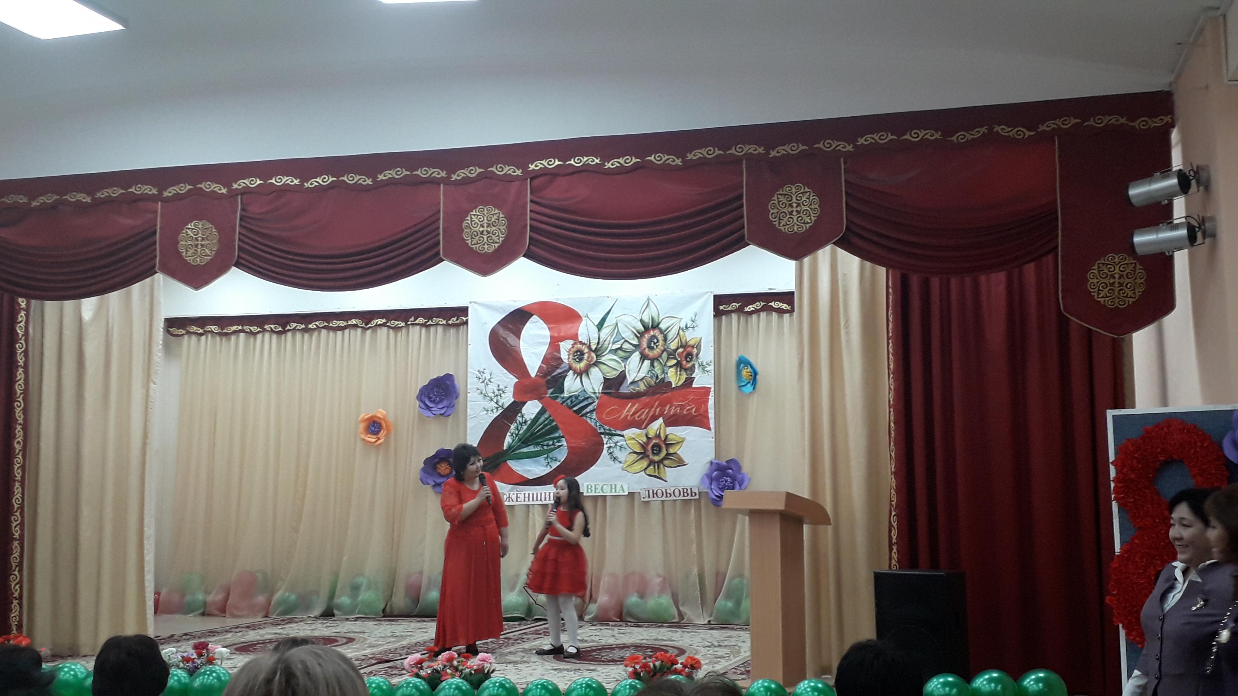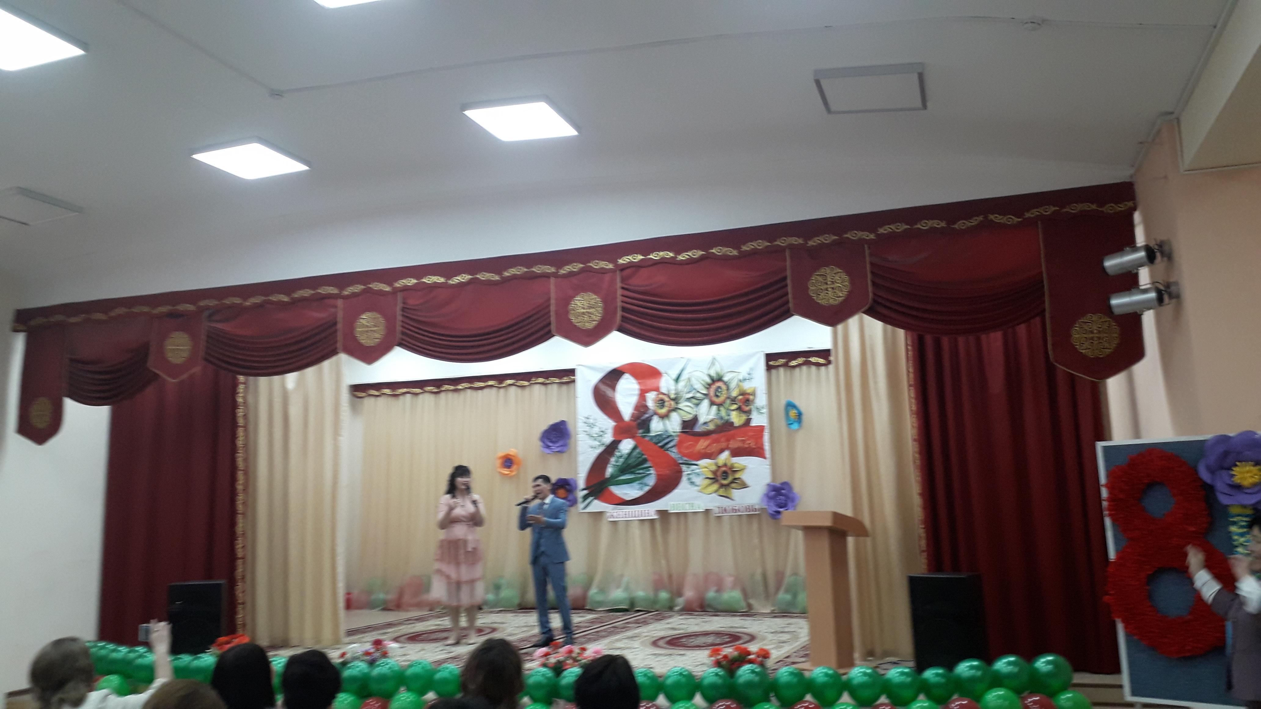 Бүгін мектебімізде 8-наурыз халықаралық әйелдер күніне ұйымдастырылған үлкен кеш өткізілді,онда мектебіміздің ұстаздары өнерлерін көрсетті./ Сегодня в нашей школе состоялся большой праздник, посвященный Международному женскому дню 8 Марта.