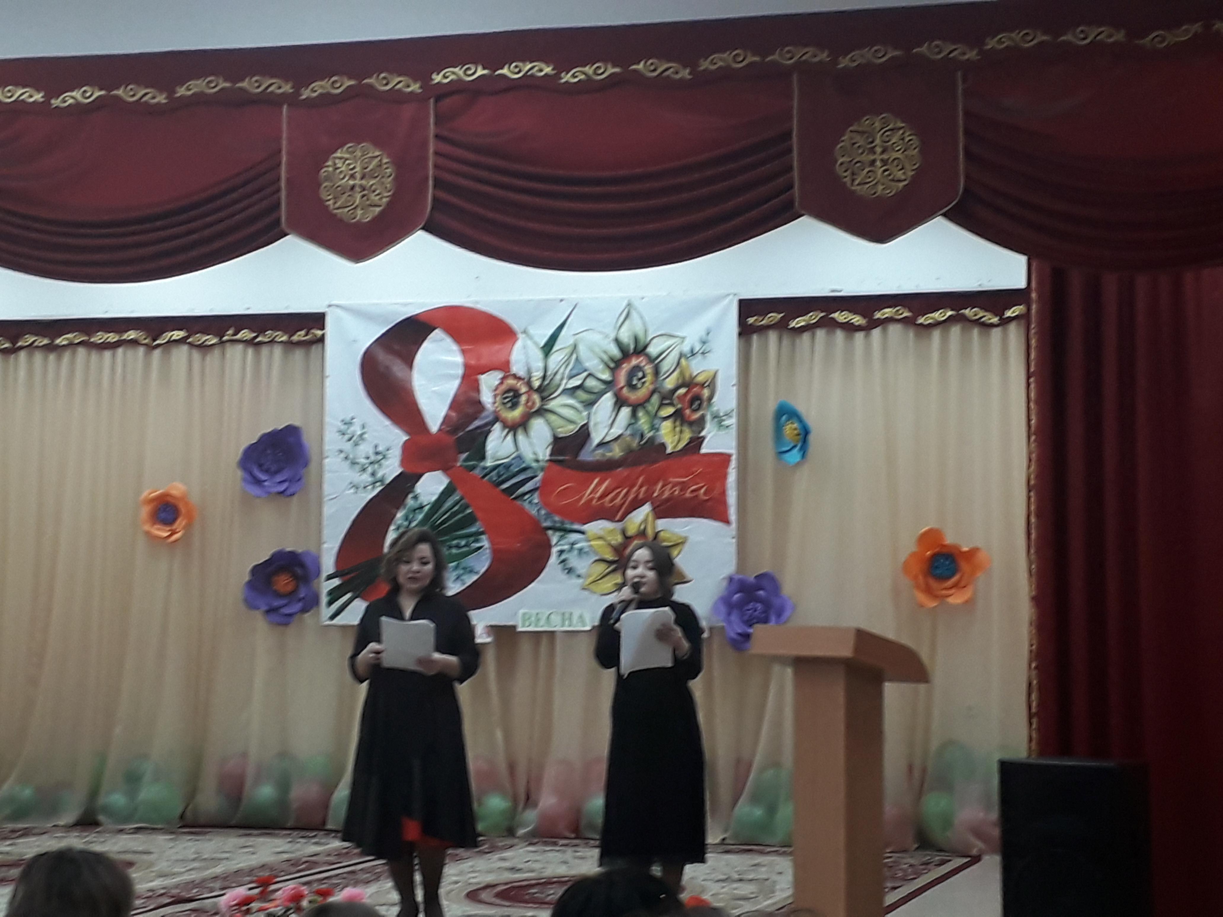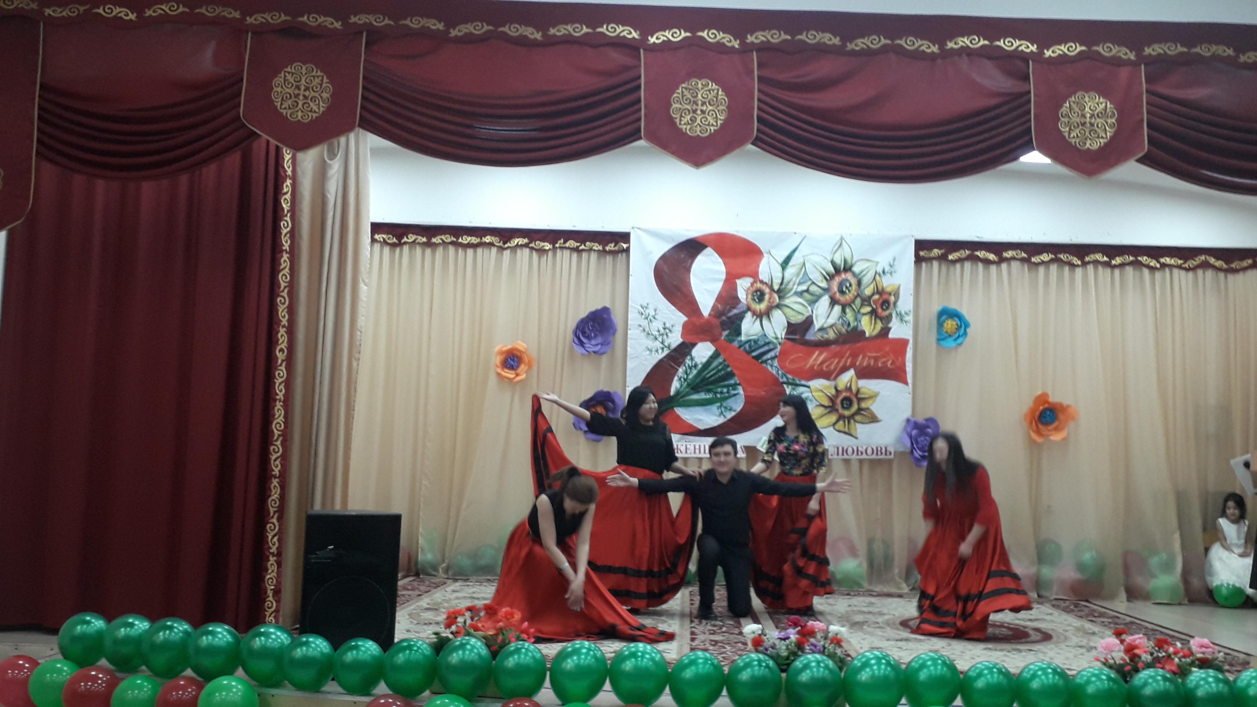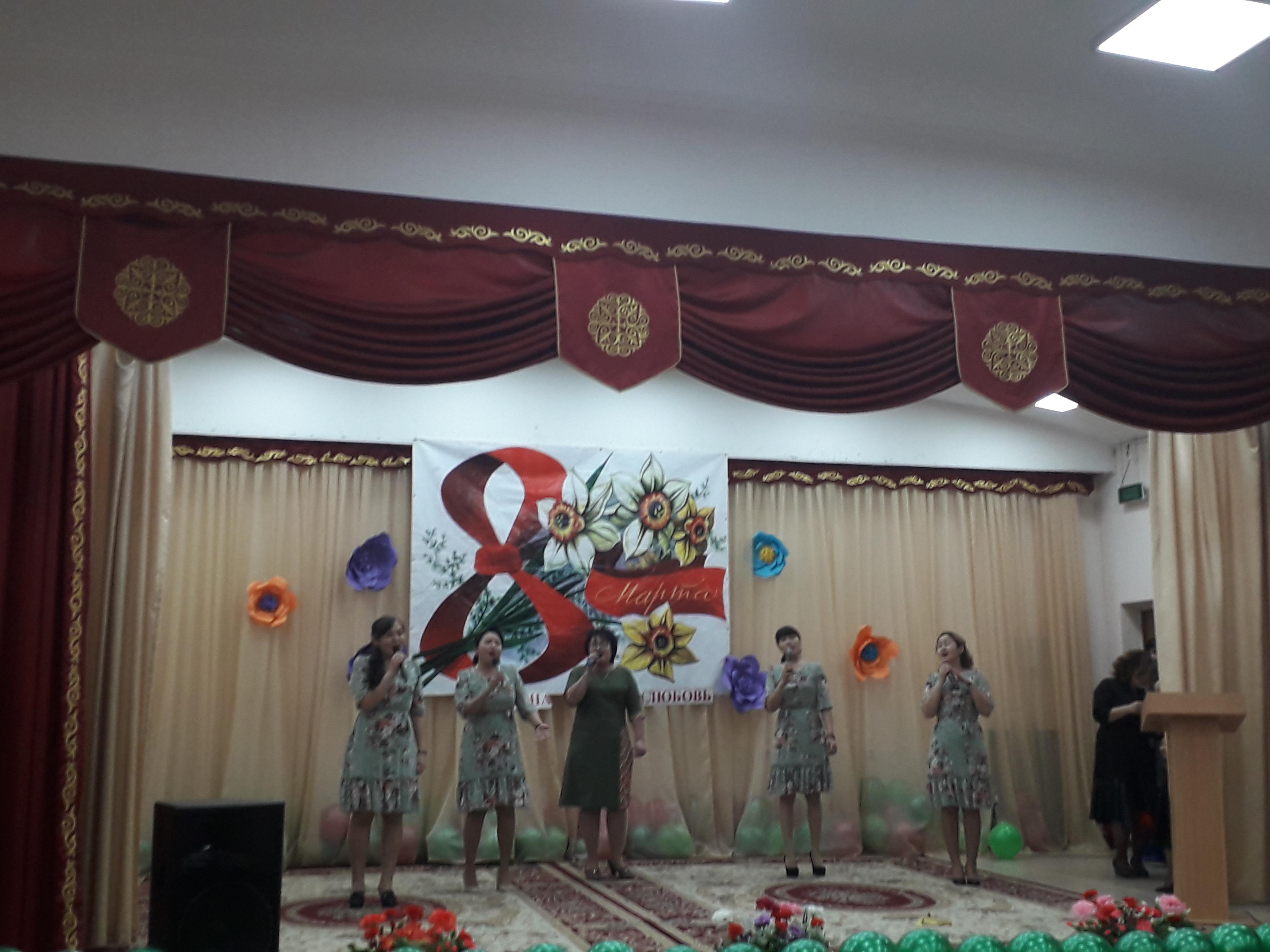 Бүгін мектебімізде 8-наурыз халықаралық әйелдер күніне ұйымдастырылған үлкен кеш өткізілді,онда мектебіміздің ұстаздары өнерлерін көрсетті./ Сегодня в нашей школе состоялся большой праздник, посвященный Международному женскому дню 8 Марта.