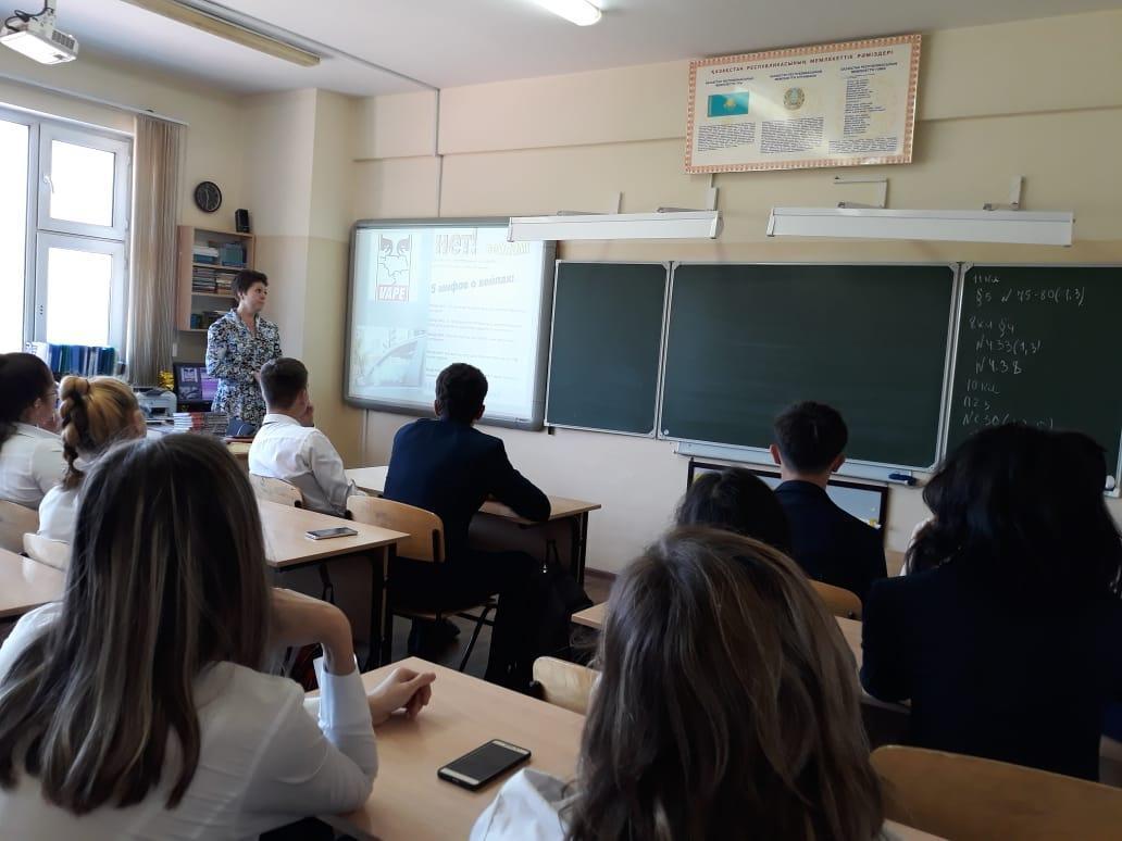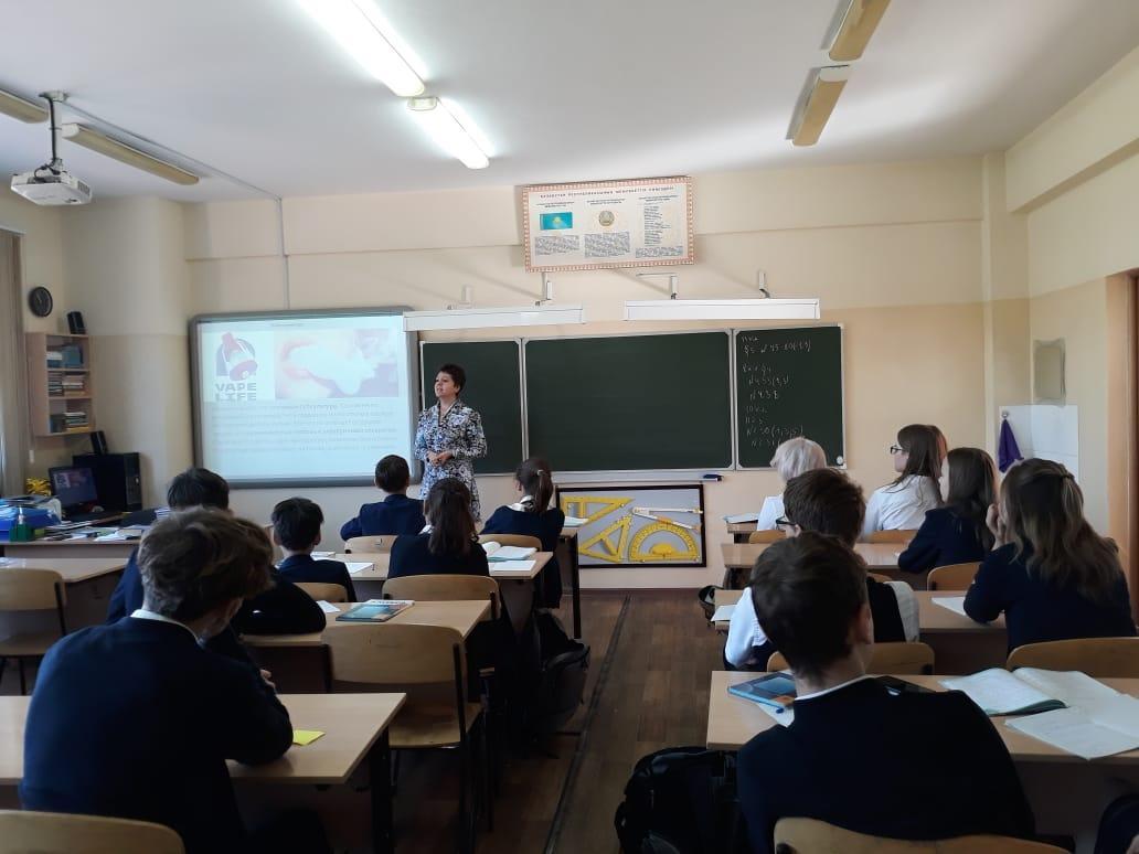 1 қарашада № 32 ЖББМ КММ-де Алматы қалалық салауатты өмір салтын қалыптастыру орталығының дәріскері психотерапевт Е. К. Вертугина және СӨСҚО атқарушы директоры Н.А. Сүлейманова 8-11 сынып оқушыларына "Электрондық темекі. Зиян немесе пайда?»