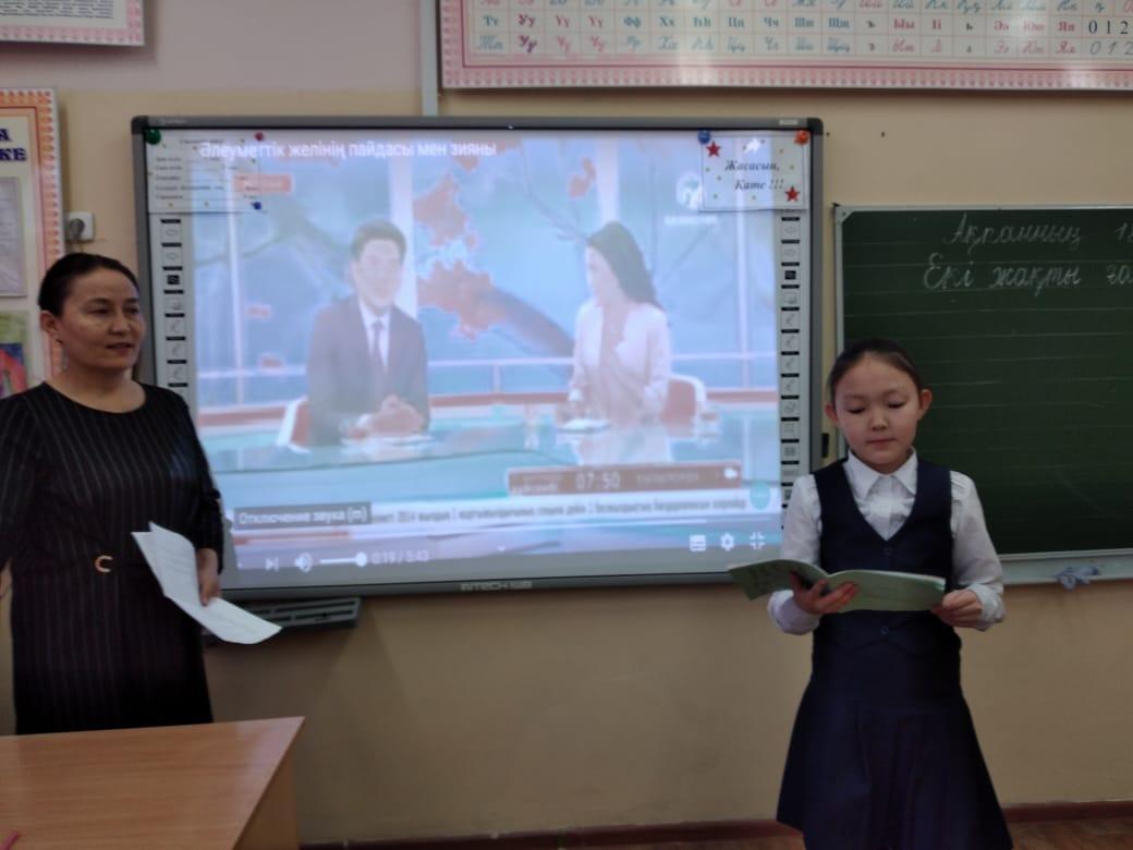 Бүгін 18 ақпанда № 32 ЖББМ КММ-де бірінші сабақта Интернет: дос немесе жау тақырыбында сынып сағаттары өтті. Сынып сағаттарының мақсаты оқушылардың компьютермен жұмыс істеуге деген қызығушылығын дамыту; оқу іс-әрекетінің танымдық мотивациясын қалыптастыру; оқушылардың сөйлеуін дамыту болды.оқушыларға жергілікті Интернет желісі туралы түсінік беру, тақырып бойынша пайымдауды үйрету, виртуалды және нақты өмірдің жағымды жағы туралы қорытынды жасау, сөздік қорын толықтыру."интернет - дос немесе жау" ұғымын түзету: ойлауды, ізгі ниетті, зейінді, бір-біріне деген құрметті дамыту.