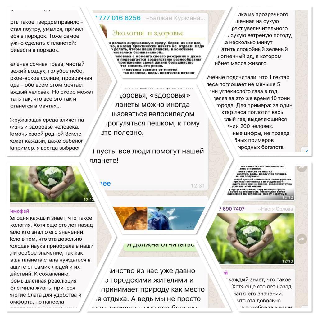 Экология, қоршаған орта, табиғат. Біз олардың қазіргі жағдайын көргенде, әйгілі француз ғалымының сөздері есте қалады:"Кейде адамның мақсаты жер шарын өмір сүруге жарамсыз ету арқылы өз тұқымын жою болып көрінеді". Өкінішке орай, бұған келісуге тура келеді. Дүниежүзілік денсаулық сақтау ұйымының мәліметі бойынша, күн сайын әлемде 8000-ға жуық адам ластанудан қайтыс болады. Сол себепті әлемнің ең кедей аймақтарында шамамен әрбір бесінші бала 5 жасқа дейін өмір сүрмейді. Жердегі баланың әрбір үшінші өлімінің себебі судың ластануы болып табылады.Біздің мектептің оқушылары шетте қалмады, экологиялық проблемалар әрқашан өзекті. Сабақтан бос уақытында олар экология тақырыбына суреттер салып, эссе жазды, осы тақырып бойынша бейнематериалдармен бөлісті.