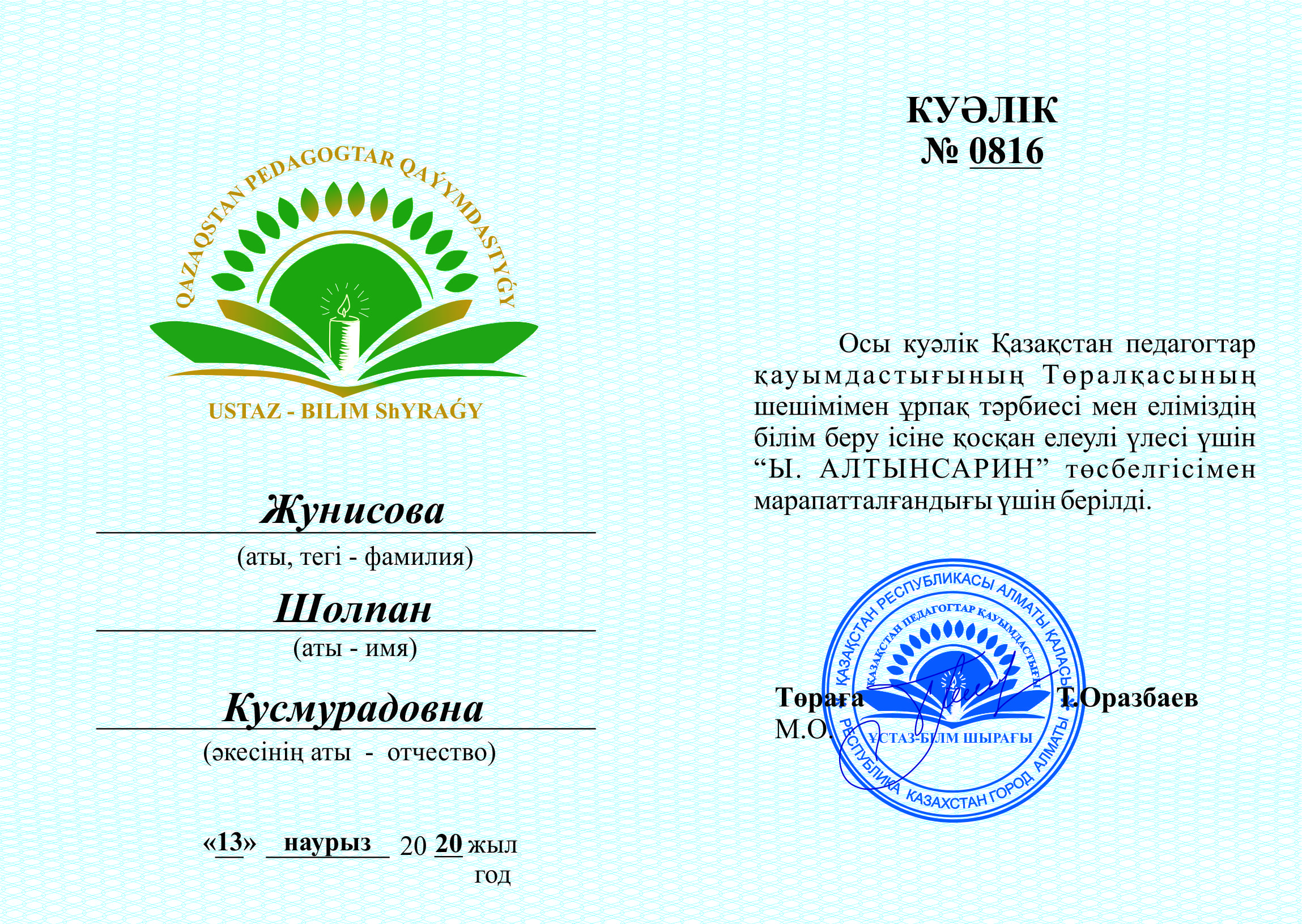 Заманауи мектептің жүрегі- мұғалімнің беделі жоғары болуы қажет. Бұл туралы күні кеше Елбасы жолдауында баса айтылды. Мектебіміздің мұғалімі Жунусова Шолпан Кусмурадовна "Ыбырай Алтынсарин" төсбелгісімен марапатталды.