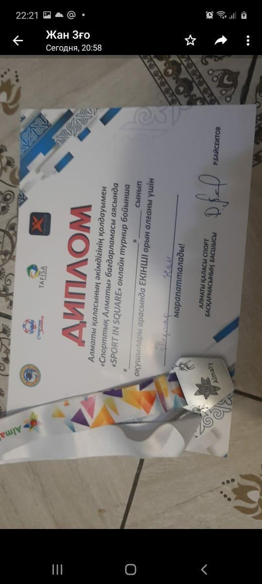 Алматы қаласының әкімдігінің қолдауымен "Спорттық Алматы"бағдарлама аясында "Sport in SQURE" онлайн турнир бойынша бастауыш сынып оқушылары Тоқтар Жан және Тулене Сержан белсене қатысып дипломмен марапатталды.
