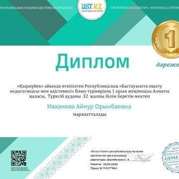 №32 ЖББМ мұғалімі Маханова Айнур Орынбаевна Республикалық «Бастауышта оқыту педагогикасы мен әдістемесі» атты блиц-турнирінің жеңімпазы атанып дипломмен марапатталды.