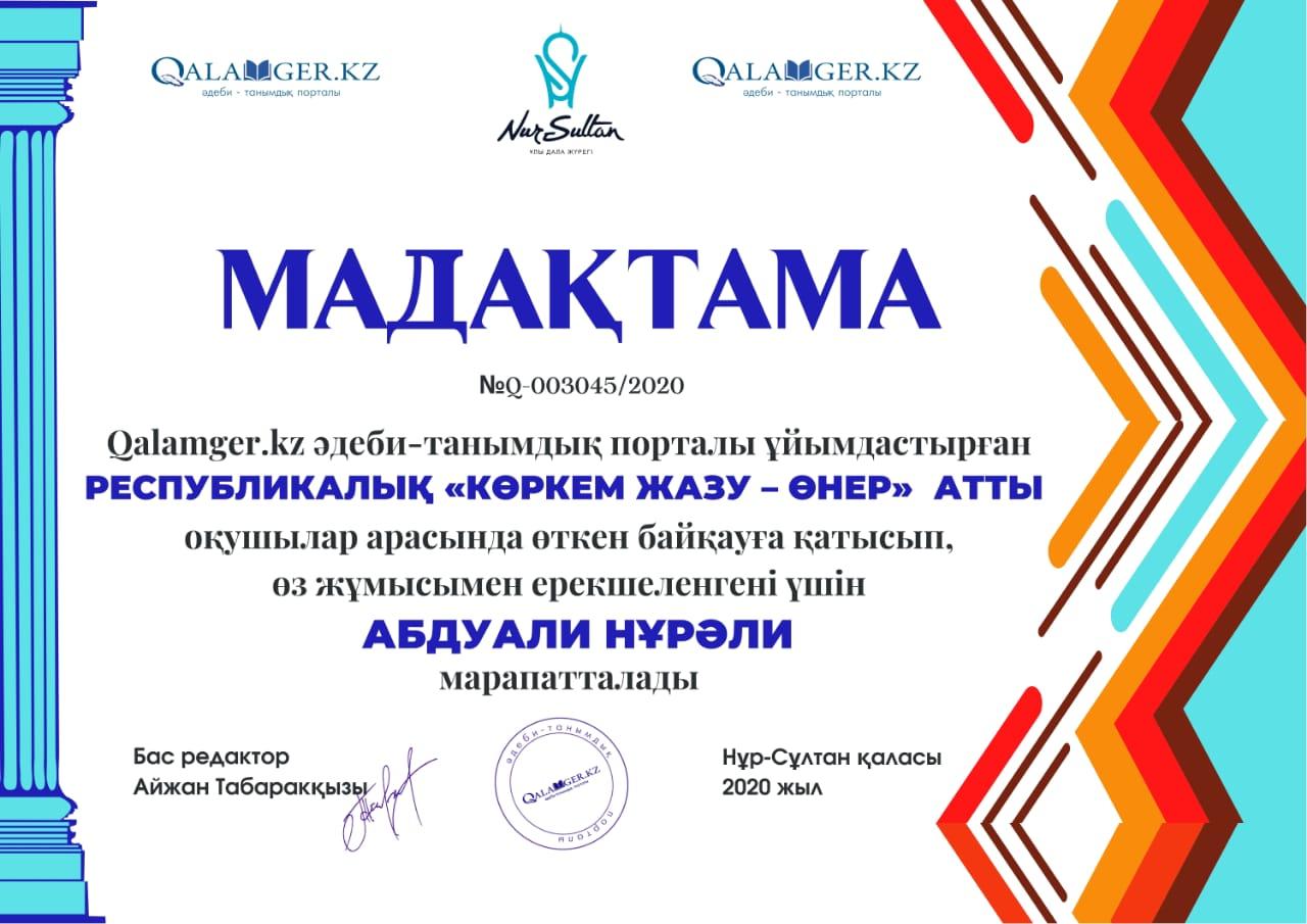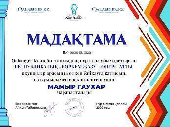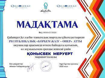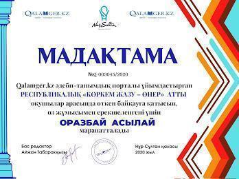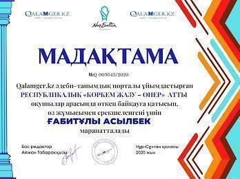 №32 ЖББМ бастауыш сынып оқушылары Абдисаттер Ділназ,Ғабитұлы Асылбек,Қонысбек Меруерт,Маматаева Жансая,Мамыр Гаухар, Абдуали Нұрәли, ОразбайАсылай Республикалық «Коркем жазу-өнер» атты байқауға қатысып өз жұмыстарымен ерекшеленгені үшін мадақтамамен марапатталды.Қатыстырған оқушылары үздік нәтиже көрсеткені үшін ұстазы Оспанбекова Шолпан Галеновна алғыс хатпен марапатталды.