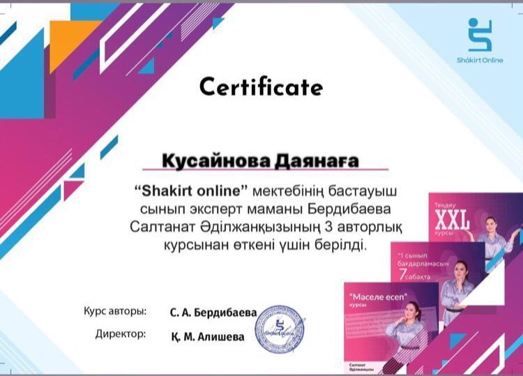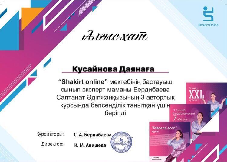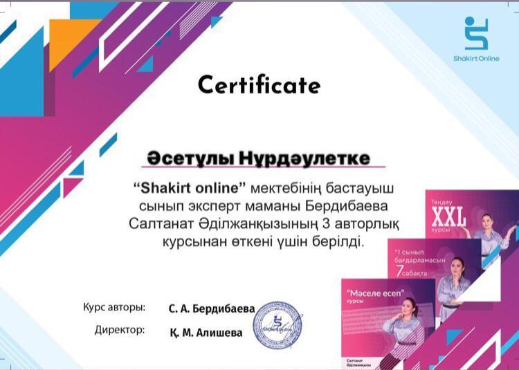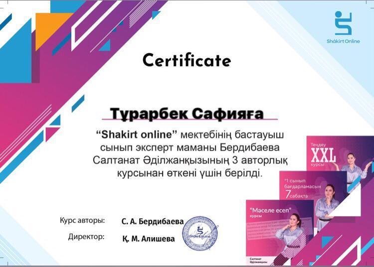 №32 ЖББМ КММ 3Ғ сынып оқушылары Серікбек Айтбек,Тұрарбек Сафия,Әсетұлы Нұрдаулет,Кұсайнова Даяна «Shakirt online» мектебінің бастауыш сынып эксперт маманы Бердибаева Салтанат Әділжанқызының 3 авторлық курсынан өткені үшін Алғыс хатпен және сертификатпен марапатталды.