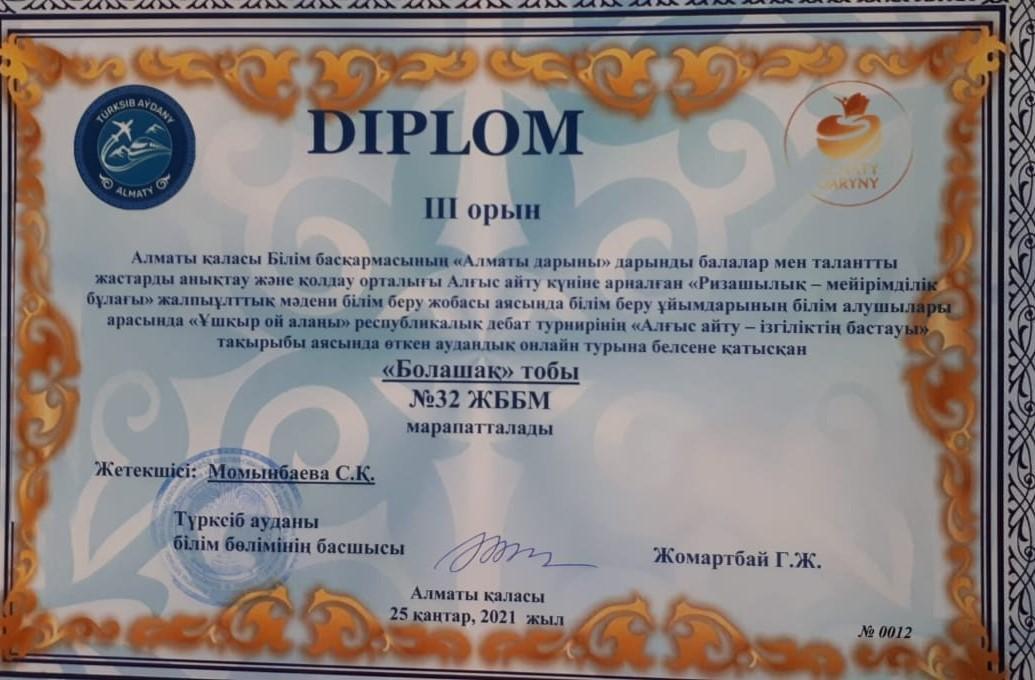 Алматы қаласы Білім басқармасының «Алматы Дарыны» дарынды балалармен жастарды қолдау орталығы Алғыс күніне арналған «Ризашылық- мейрімділік бұлағы»жалпыұлттық мәдени білім беру жоба аясында «Ұшқыр ой аланы» республикалық дебат турнирінің «Алғыс айту-ізгіліктің бастауы»тақырыбында өткен аудандық дебаттық турнирда №32ЖББМ «Болашақ» тобы ІІІ-орынды иеленді.