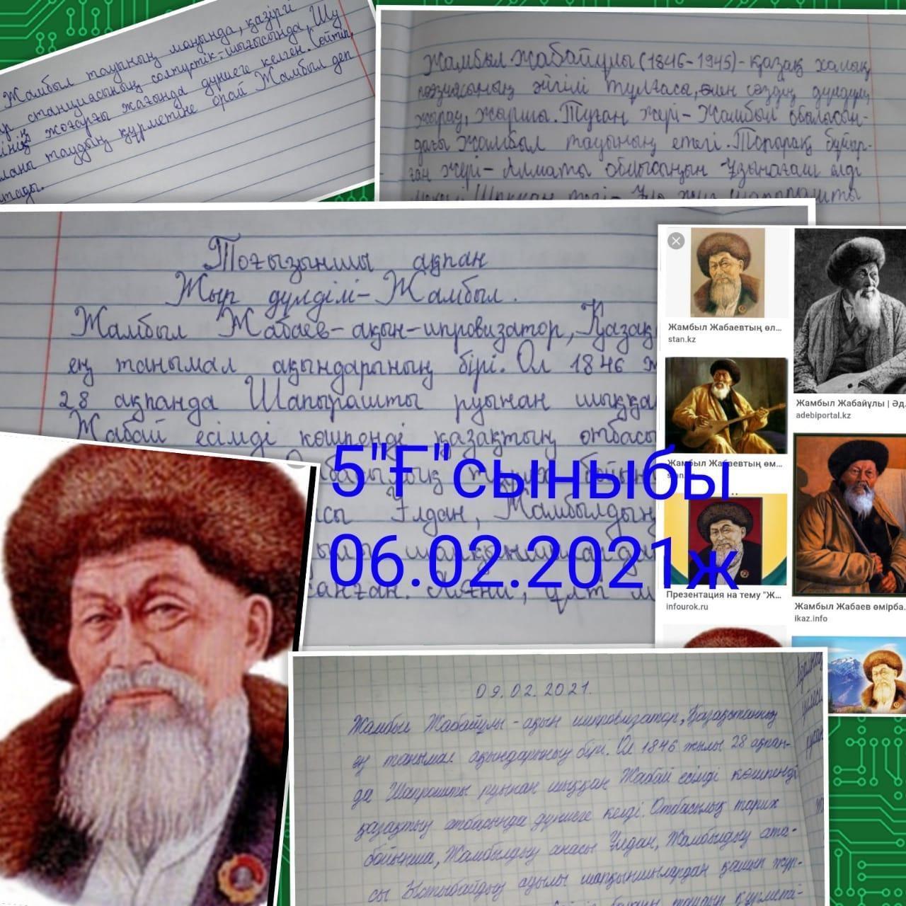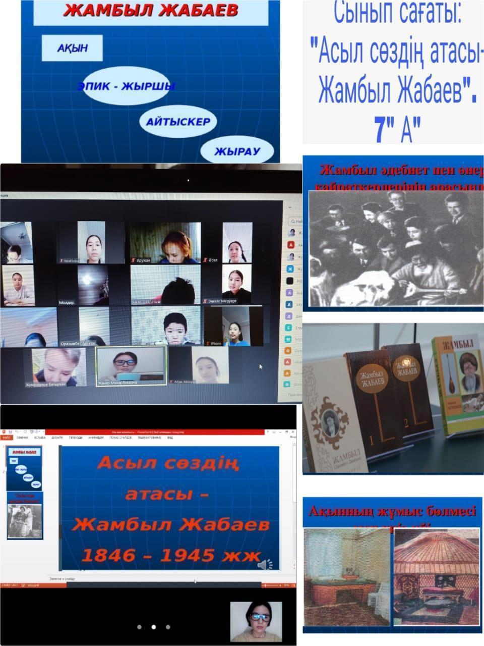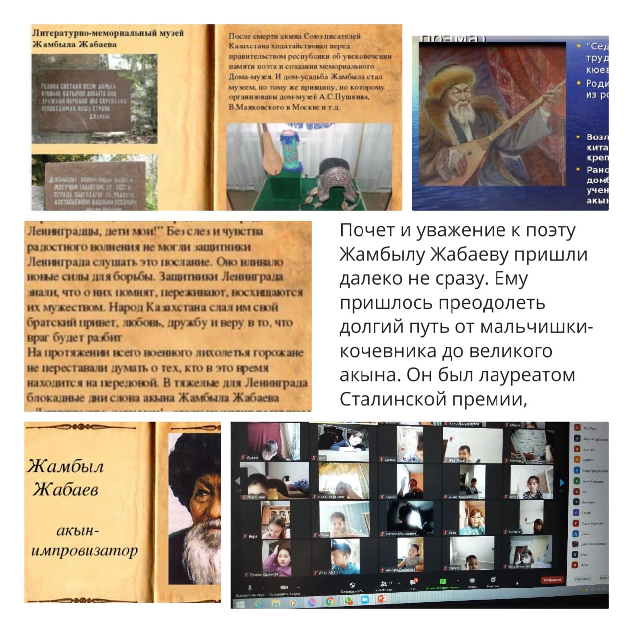"Ұлы ақын Жамбыл Жабаевтың туған күніне : қоршаудағы Ленинградтың балалары"сынып сағаттары Жамбыл Жабаевтың шығармашылығы Қазақстанның рухани қазынасына заңды түрде енді. Сөзсіз және мәңгілік адами құндылықтарға сүйене отырып, ол тірі, бейнелі, жылы сөзге қымбат адамдар үшін қызығушылық тудырады. Аңызға айналған ақынның тағдыры да ағартушылық. Жамбыл өз дәуірінің жалынды және шынайы әншісі болды. Ол өз жұмысында қоршаудағы Ленинградтың балаларына үндеу қолдап, жазды.