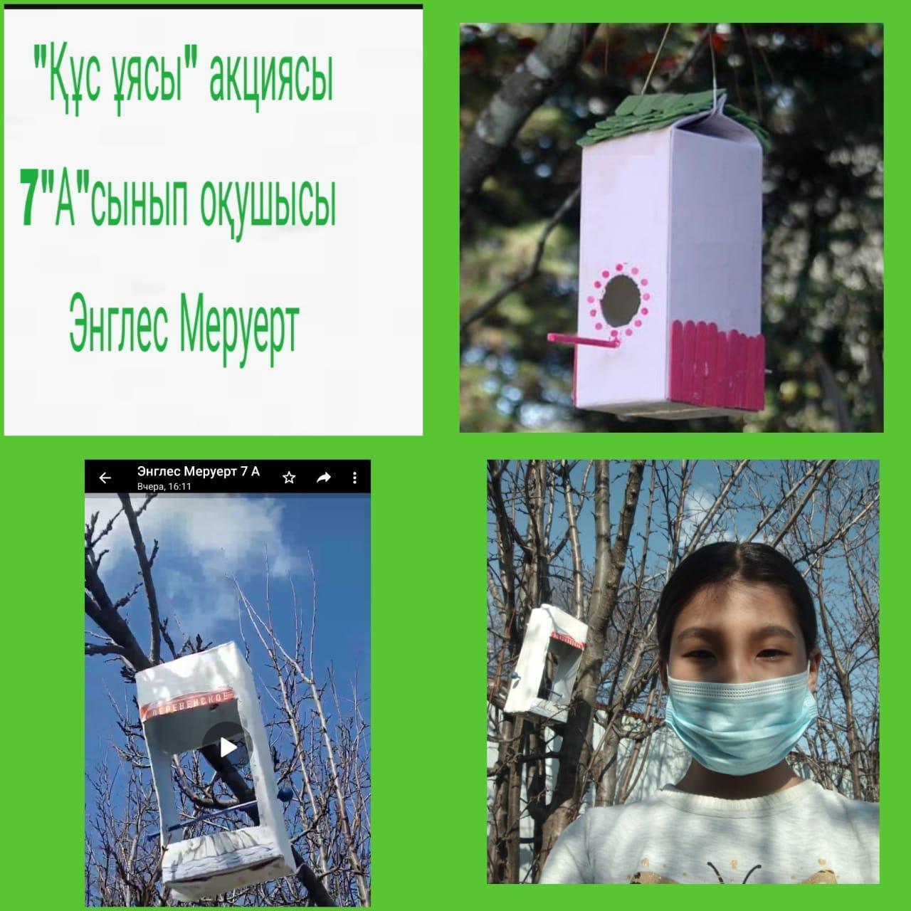 №32 ЖББМ КММ-де экологиялық тәрбие айлығы аясында 1-30 сәуір аралығында "Құс үйі" акциясы өткізіледі. Акцияның негізгі мақсаты: қоныс аударатын құстарға қамқорлықпен қарауға тәрбиелеу; баланың өзін - өзі дамытуы үшін қолайлы жағдайлар жасау; - балалардың құстарға қамқорлық жасауға деген ұмтылысы.Балалар жасады табиғи материалдан жасалған құс үйлері ,қораптардан,пластиктен, ағаштан жасалған құс үйі, Акция жалғасуда.