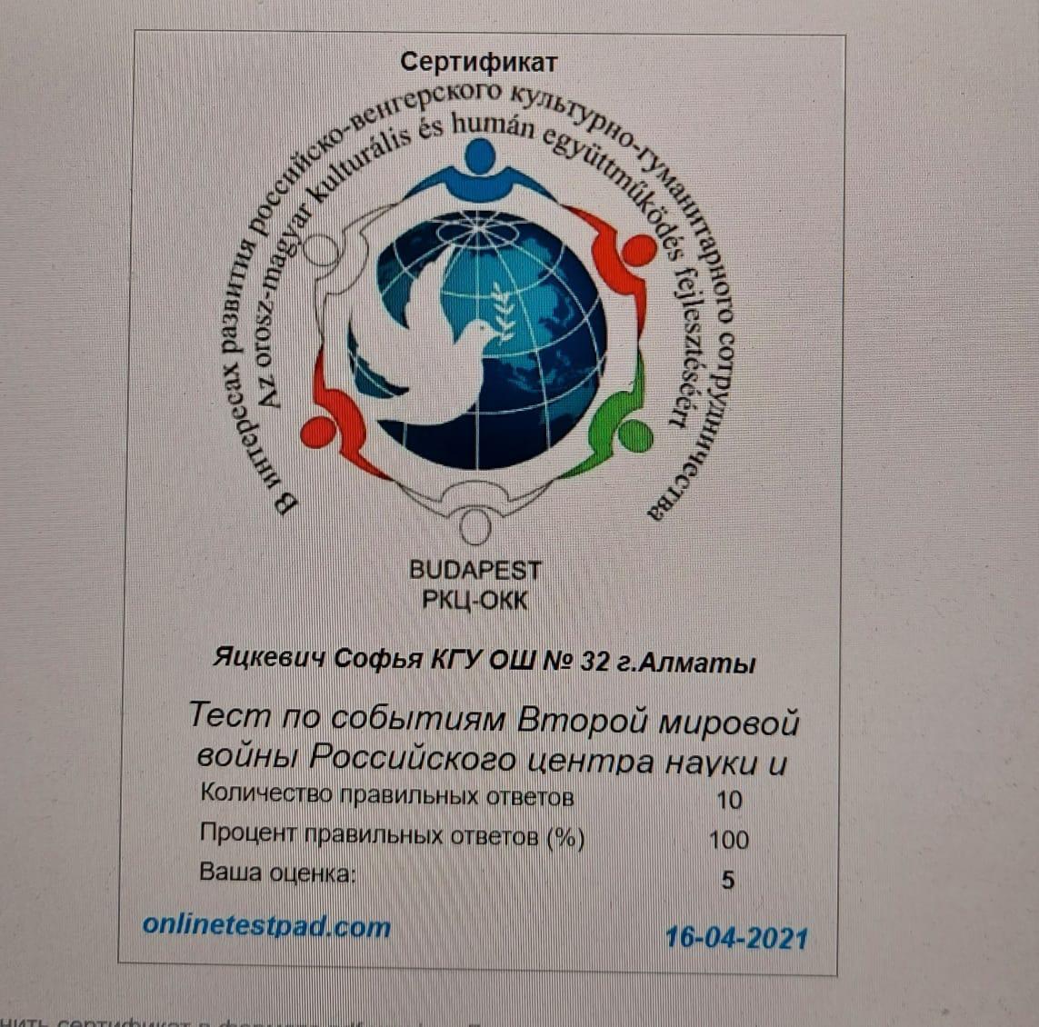 № 32 ЖББМ КММ де жауынгерлік даңқ мұражайы халықаралық ынтымақтастыққа қатысады. 16 сәуірде мұражай белсенділері Будапешттегі (Венгрия) Ресей Ғылым және мәдениет орталығының тестінен өтті.Сертификаттармен марапатталды.