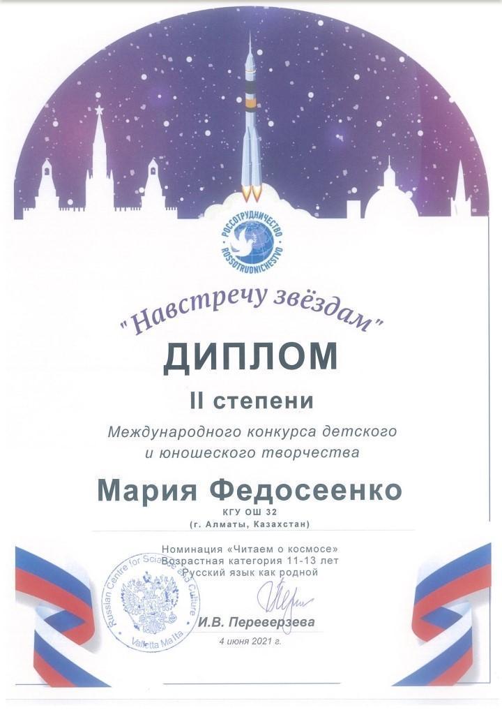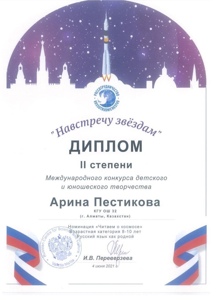 Мектеп оқушылары Федосеенко Мария мен Пестикова Арина "Жұлдыздармен қарай" Халықаралық байқауына қатысқаны үшін ІІ дәрежелі дипломдармен марапатталды