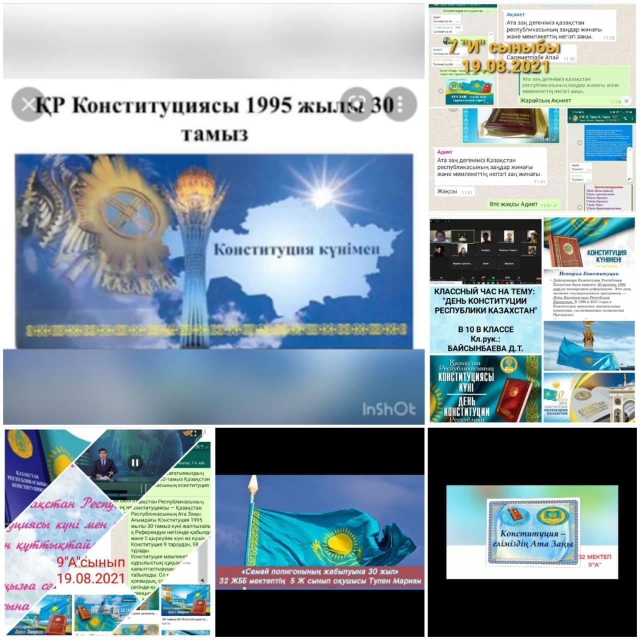 В целях решения задач гражданского, патриотического воспитания учащихся, формирования у них гордости за достижения своей страны и бережного отношения к историческому прошлому и традициям народов Казахстана , понимания ценностей демократического общества и важных качеств личности: гражданской позиции, толерантности, патриотизма, популяризации идеи единения многонационального народа, через любовь к Родине, к своему народу в школе были проведены онлайн мероприятия, посвященные Дню Конституции.