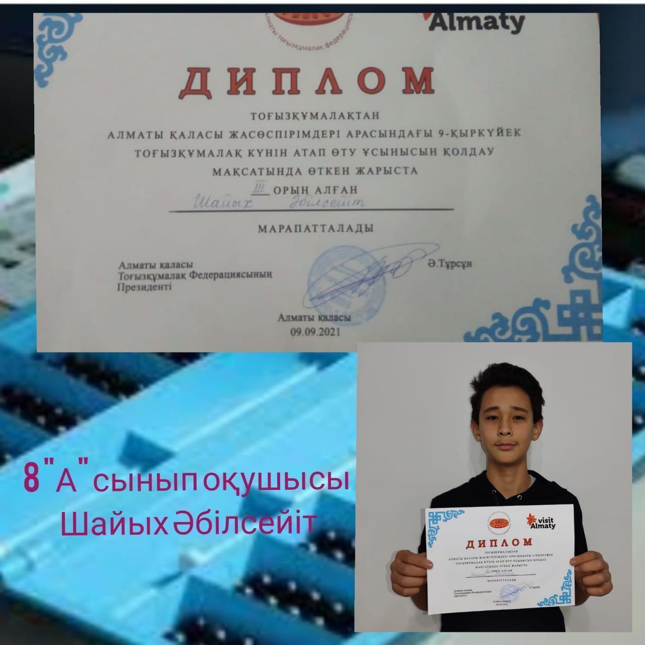 13 қыркүйек 2021 0 1 2 3 4 5 Оқушы жетістігі/ Достижение ученика Мектебіміздің 8 сынып оқушысы Шайых Әбілсейт тоғызқұмалақтан Алматы қаласы жасөспірімдері арасында өткен жарыста ІІІ орынды иеленді.Ученик 8 класса Шайых Әбілсейт занял 3 место по тоғызкумалаку.