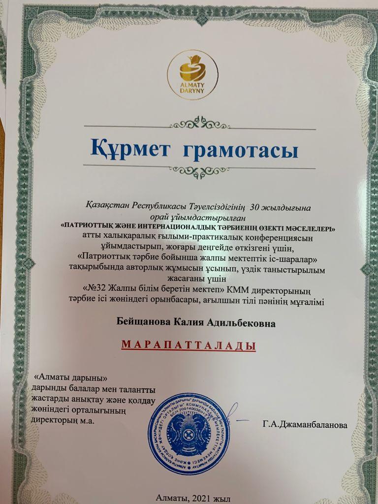 Қазақстан Республикасы Тәуелсіздігінің 30 жылдығына орай ұйымдастырылған «Патриоттық және интернационалдық тәрбиенің өзекті мәселелері» атты халықаралық ғылыми-практиқалық конференциясын ұйымдастырып,жоғары деңгейде өткізгені ушін мектебіміздің директоры Хасенова А.Р, директордың тәрбие ісі жөніндегі орынбасары Бейщанова К.А. қазақ тілі және әдебиет пәнінің мұғалімі Кұнапия А.Б. «Алматы дарыны»дарынды балалар мен талантты жастарды анықтау жіне қолдау орталығының Құрмет грамотасымен марапатталды