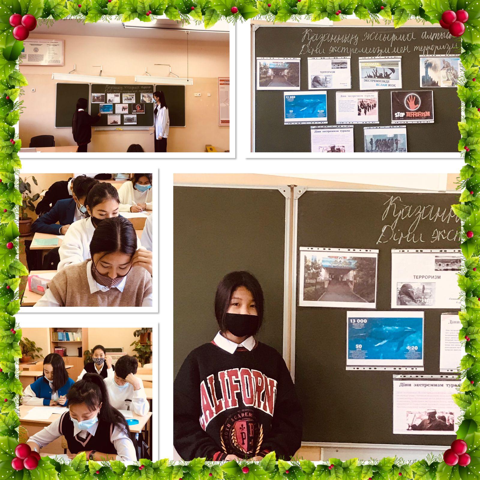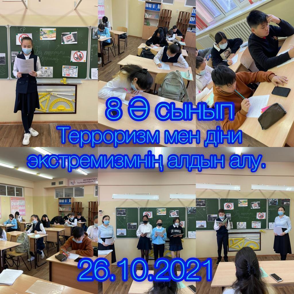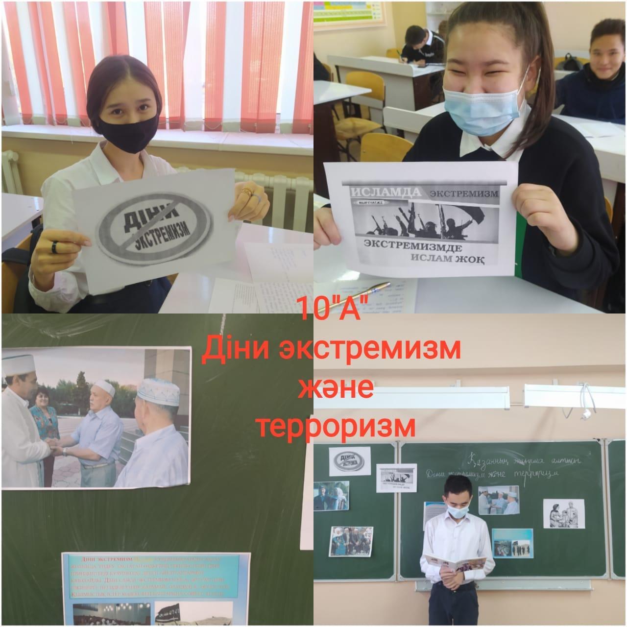 Бүгін 1 сабақ діни экстремизм мен терроризмнің алдын алу бойынша сынып сағаттарынан өтті. Сынып сағаттары экстремистік идеологияның көріністеріне төзбеушілік атмосферасын құруға бағытталған қоғамдық пікірді қалыптастыруға бағытталған. Оқушылардың экстремизм мен терроризм туралы ой-өрісін кеңейту, өскелең ұрпақтың қоғамдық санасы мен азаматтық ұстанымын қалыптастыру, бір-біріне деген толерантты көзқарасты тәрбиелеу қабілеті және басқа адамдармен тату өмір сүру қабілеті, экстремизм мен терроризмнің кез келген көрінісі жауапкершілікке әкелетінін түсіну.