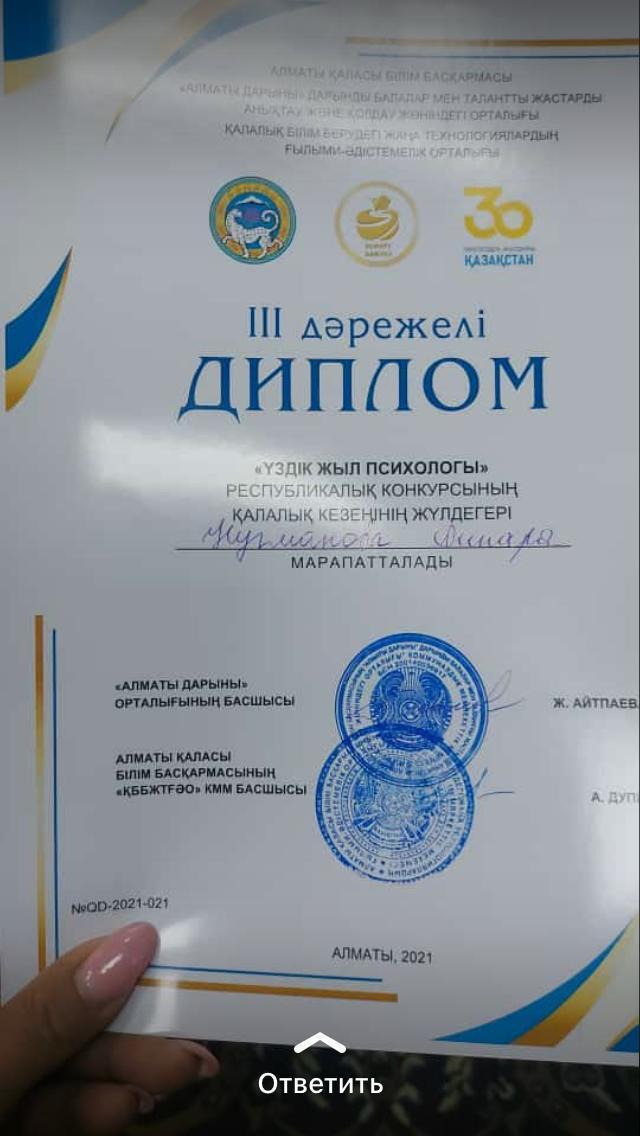 Наш школьный психолог Нугманова Д.Б. участвовала в городском этапе республиканского конкурса «Лучший психолог года» и заняла 3 место.