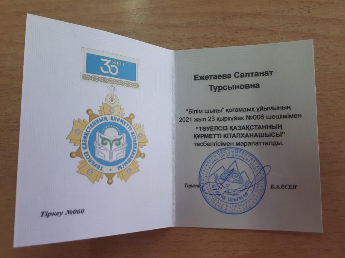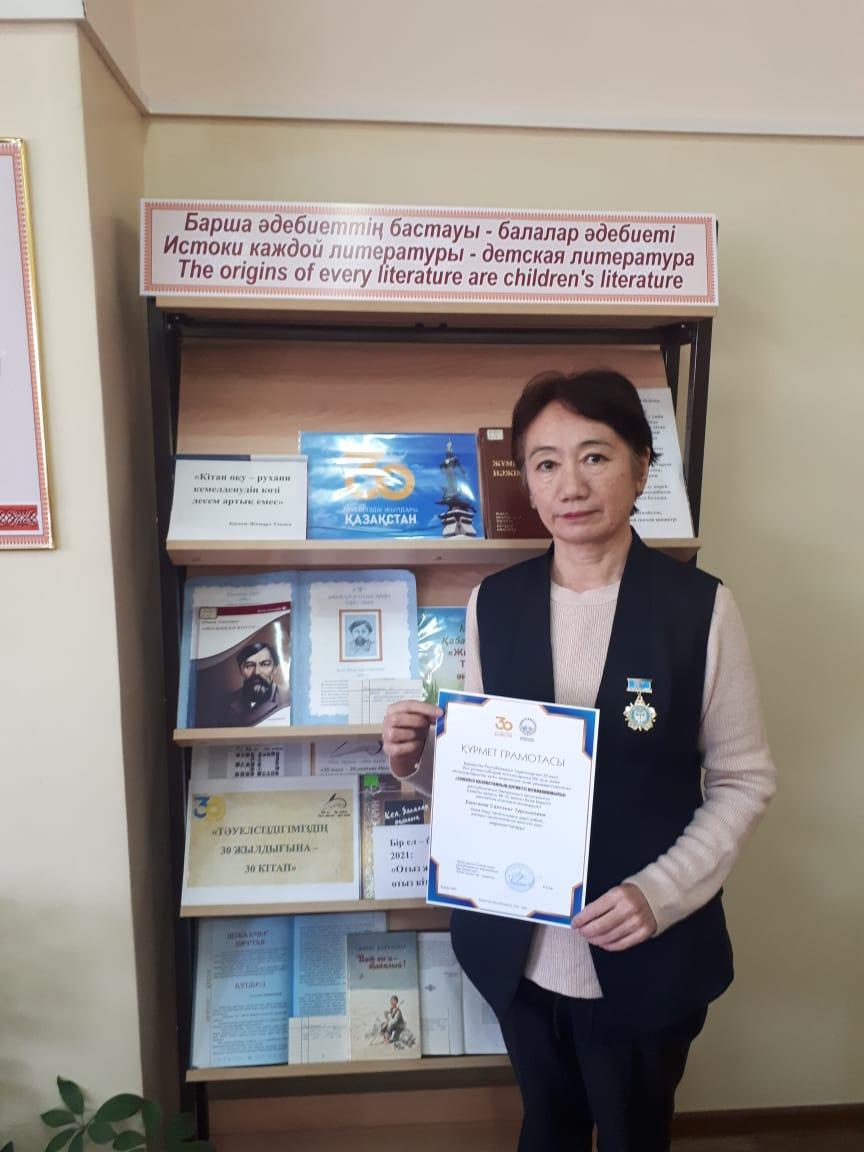 "Тәуелсіз Қазақстанның құрметті кітапханашысы" байқауынының жүлдегері./Призер конкурса "почетный библиотекарь независимого Казахстана".