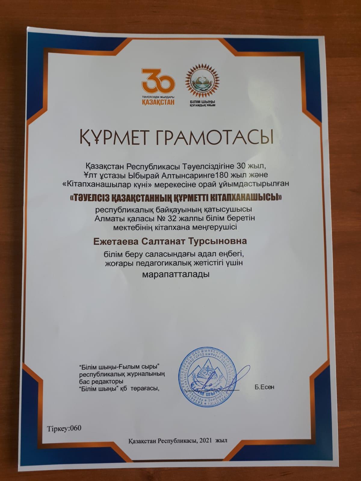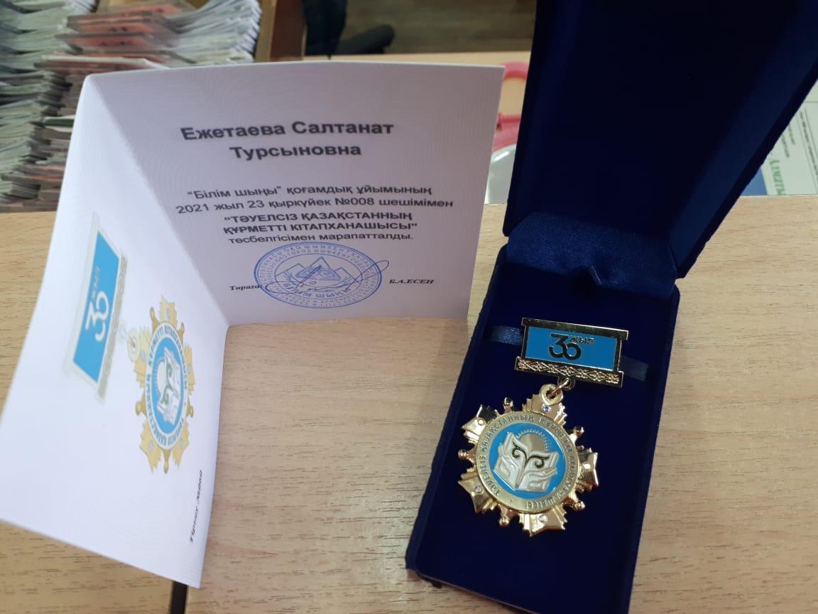 Мектебіміздің кітапханашысы Ежетаева Салтанат Тұрсыновна республикалық "Тәуелсіз Қазақстанның құрметті кітапханашысы" байқауына қатысып, білім беру саласындағы адал еңбегі жоғары педагогикалық жетістігі үшін "Білім шыңы- Ғылым сыры" республикалық журналының құрмет грамотасымен және "Тәуелсіз Қазақстанның құрметті кітапханашысы" төсбелгісімен марапатталды. Библиотекарь нашей школы Ежетаева Салтанат Турсыновна приняла участие в республиканском конкурсе "почетный библиотекарь независимого Казахстана", где за добросовестный труд в области образования была награждена Почетной грамотой республиканского журнала "Білім шығы - Ғылым сыры" и нагрудным знаком "Почетный библиотекарь независимого Казахстана".