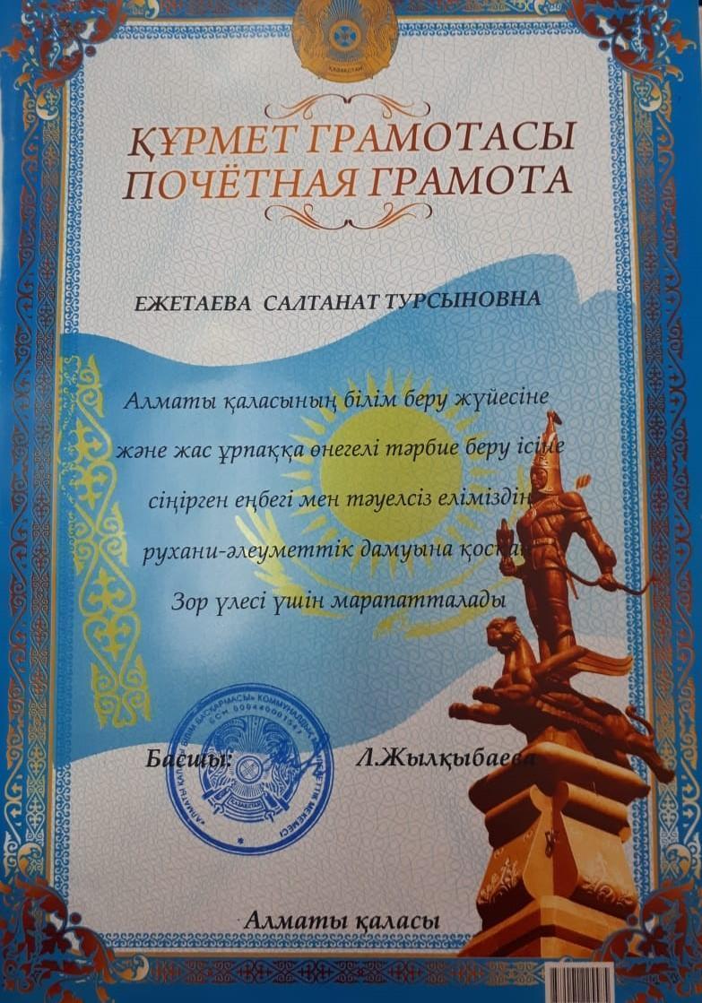 Мектеп кітапханашысы С. Ежетаева өскелең ұрпақты тәрбиелеу ісіне қосқан үлесі үшін Алматы қаласы білім басқармасының Құрмет грамотасымен марапатталды.