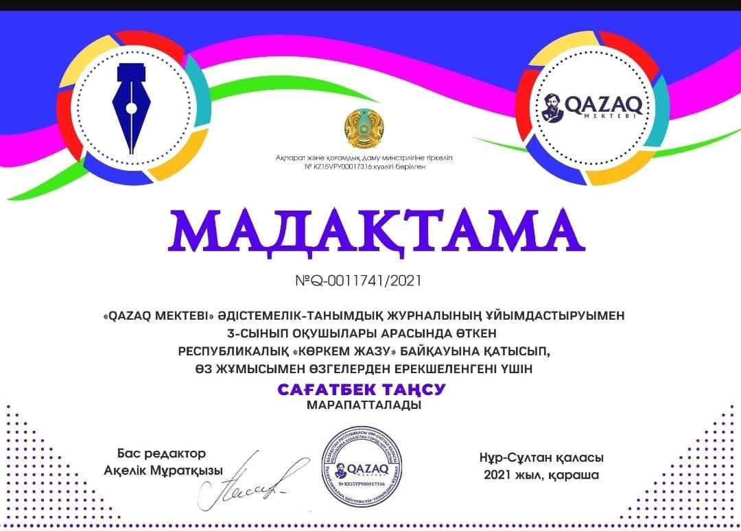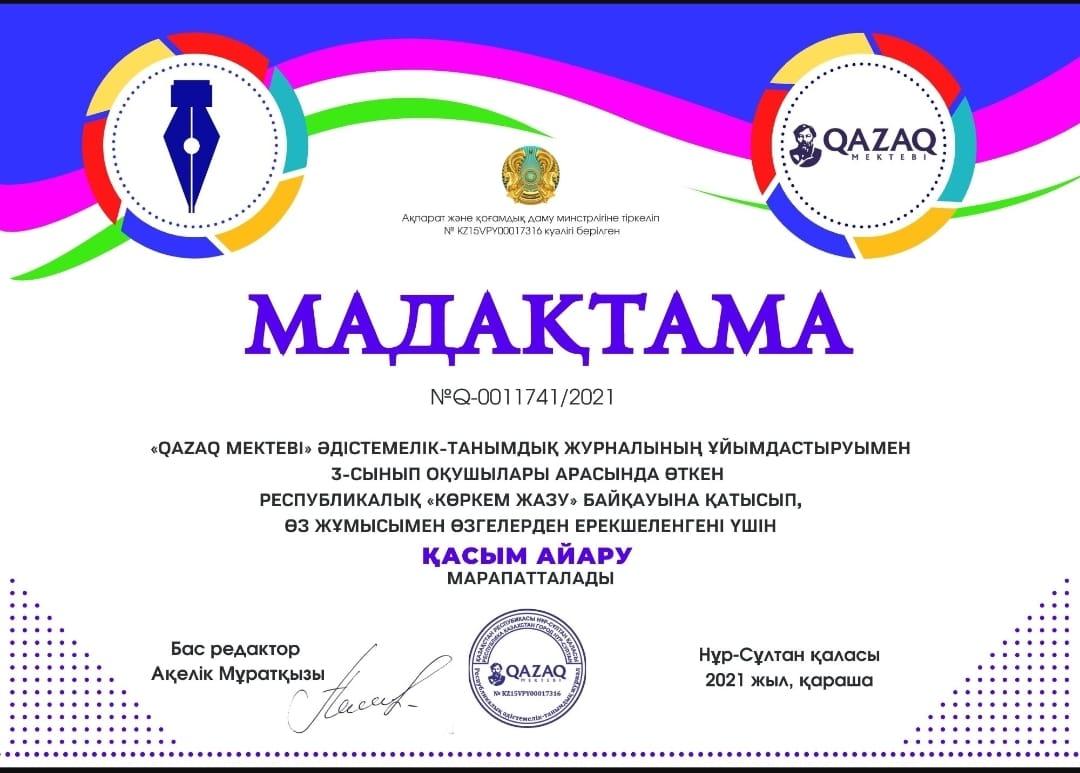 "Qazaq mektebi " әдістемелік-танымдық журналының ұйымдастыруымен өткізілген республиқалық "көркем жазу " байқауына мектебіміздің 3 сынып оқушылары Қасым Айару,Сағатбек Таңсу,Серікқызы Аяла қатысып өз жұмыстарымен өзгелерден ерекшеленгені үшін мадақтамамен марапатталды. Шәкірттері үздік нәтиже көрсеткен үшін мектебіміздің мұғалімі Кадирова Жадыра Саутбековна алғыс хатпен марапатталды.