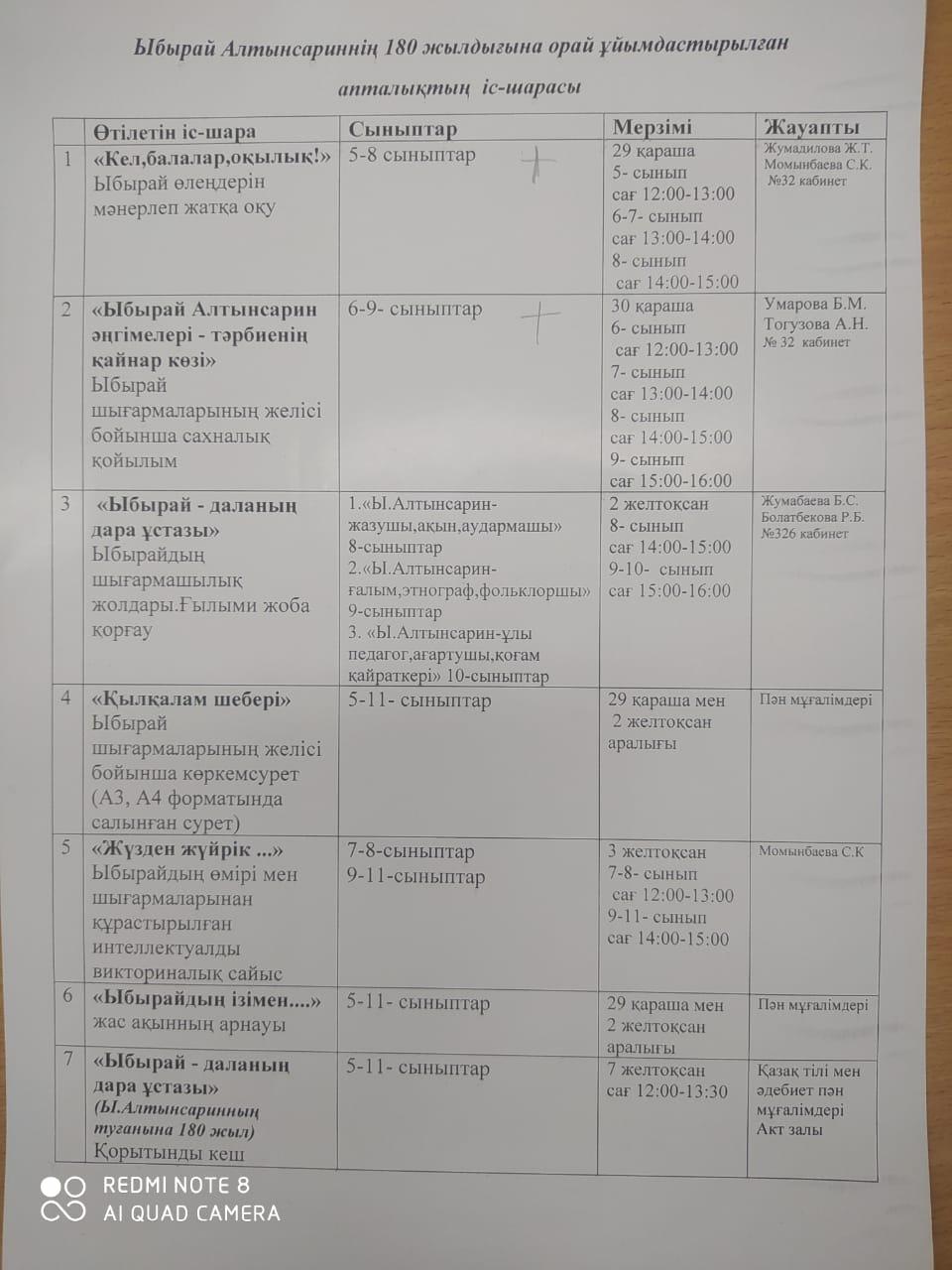 В этом году в связи со 180-летием со дня рождения первого учителя казахского народа, педагога-просветителя, поэта, ученого, фольклориста,этнографа, общественного деятеля Ибрая Алтынсарина по Республике Казахстан проводятся масштабные мероприятия. На основании данного республиканского плана мероприятий в школе с 29.11 по 07.12.2021 запланировано внутришкольное декадниковое мероприятие "Ыбырай -даланың дара ұстазы", организованное учителями казахского языка и литературы по казахским классам в период с 5 по 11 классы.