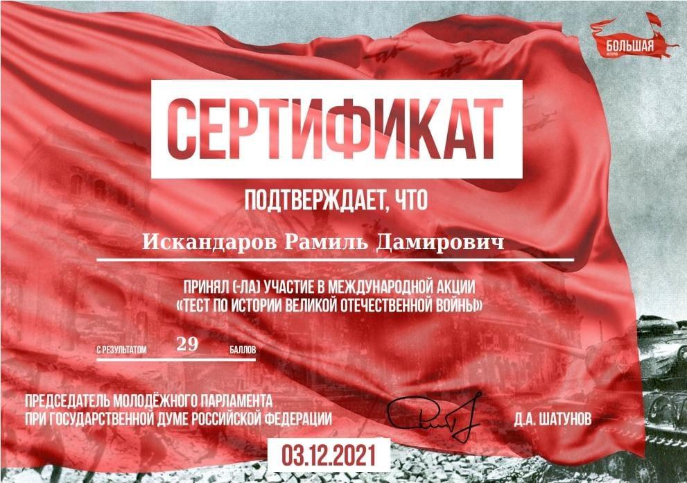 09 желтоқсан 2021 0 1 2 3 4 5 Халықаралық акцияға қатысушылар/Участники международной акции Біздің мектептің оқушылары Чащин Михайл и Искандаров Рамиль "ҰОС тарихы бойынша Тест"халықаралық акциясына қатысты.Учащиеся нашей школы Чащин Михайл и Искандаров Рамиль приняли участие в Международной акции «Тест по истории ВОВ»