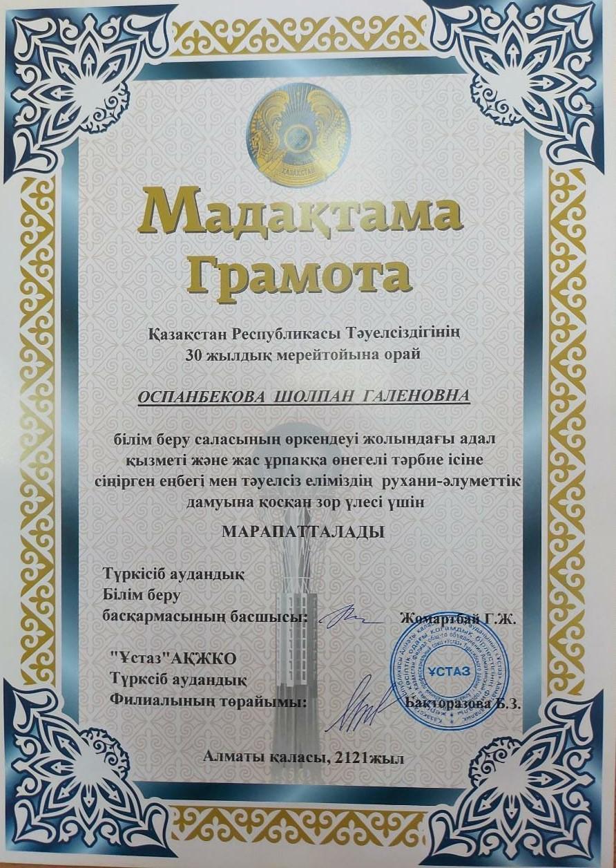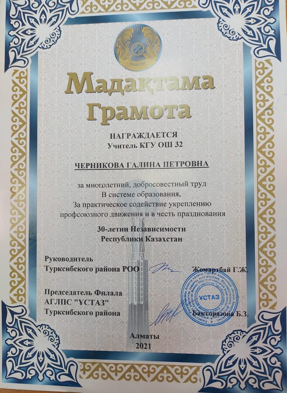 В честь празднования 30-летия Независимости РК учителя школы Черникова Г.П.Когабаева А.К. Бондаренко О. Өскенбай Г,Оспанбекова Ш награждены грамотами районного профсоюзного комитета "Ұстаз".