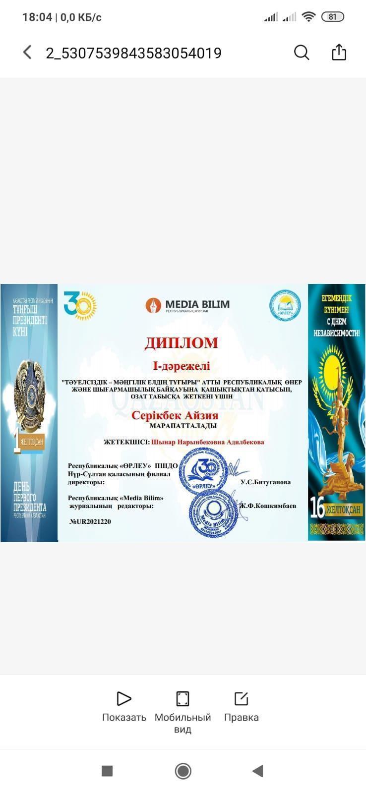 За успехи в дистанционном участии в республиканском конкурсе искусств и творчества "Тәуелсіздік-мәнгілік елдің тұғыры" награждены Кожатай Айганым и Серикбек Айзия.