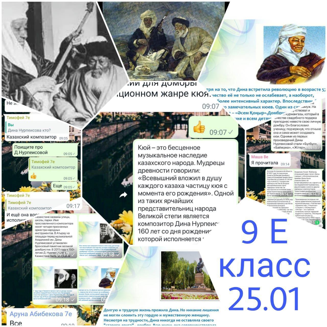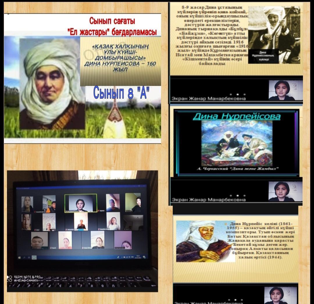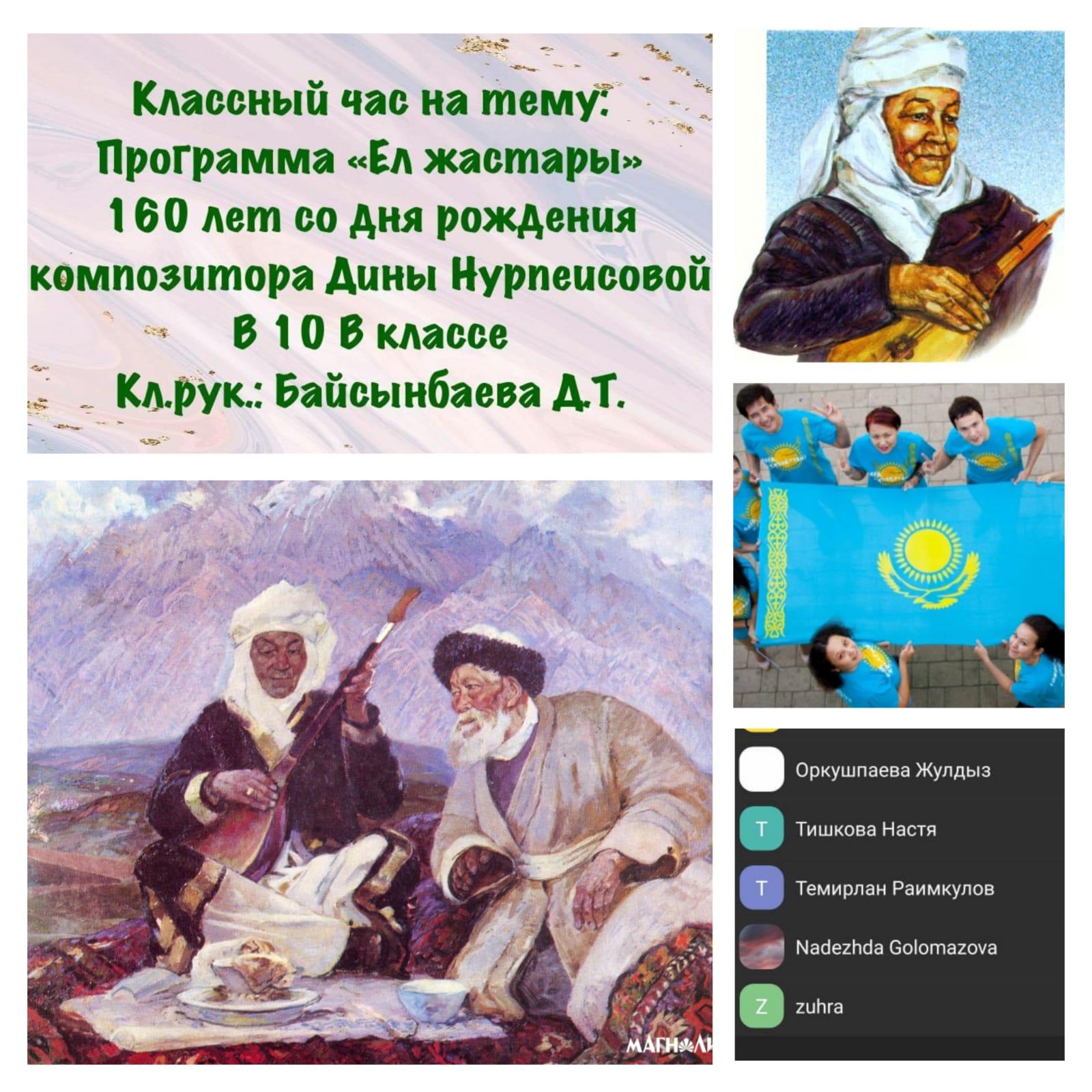 В рамках программы «Рухани жаңғыру», спецпроекта «Великие имена великой степи» сегодня 1 уроком прошли классные часы по теме "Творческое наследие Дины Нурпеисовой. При проведении мероприятий по программе «Рухани жаңғыру» классные руководители ознакомили обучающихся с великими и творческими людьми из Казахстана. Таким образом, у обучающихся формируется патриотическое сознание, любовь к Родине, почитание народного наследия, стремление к дальнейшему развитию творчества и следование примеру великих людей казахской степи.