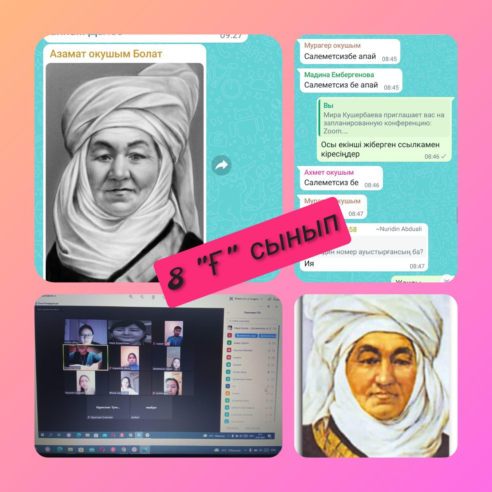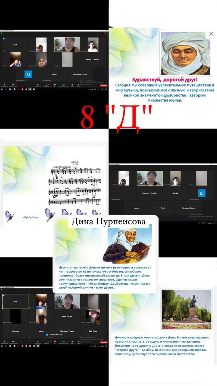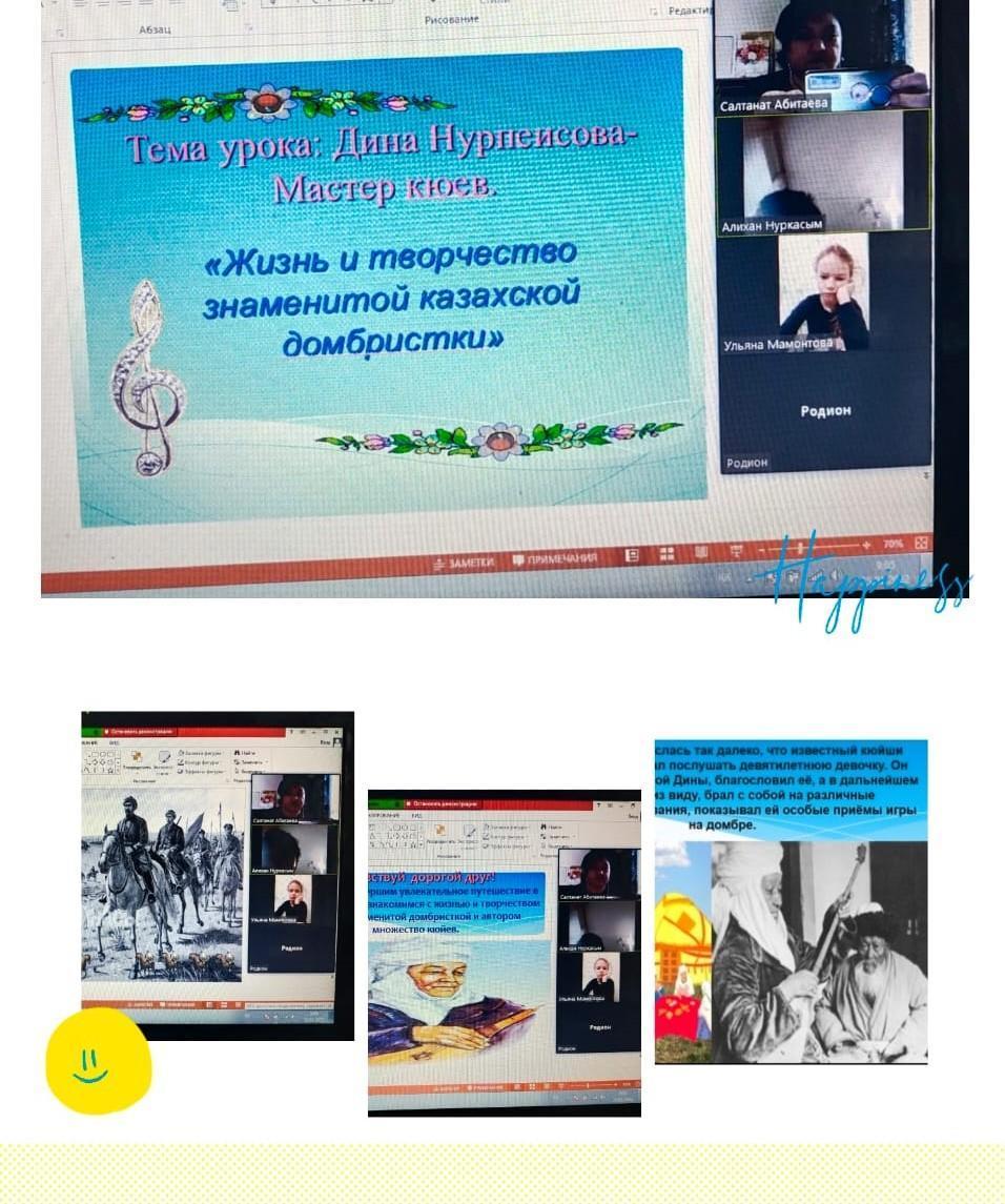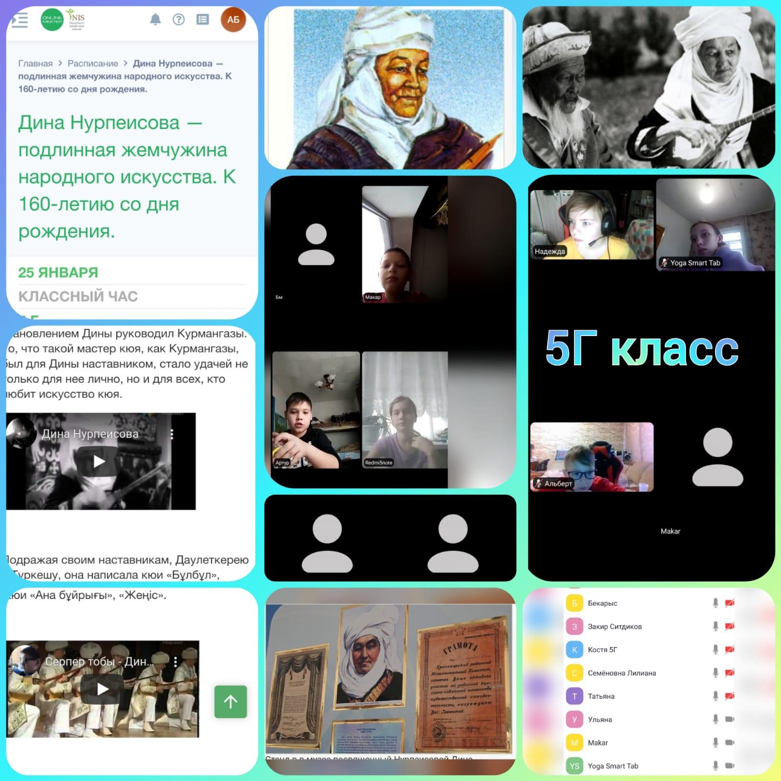 В рамках программы «Рухани жаңғыру», спецпроекта «Великие имена великой степи» сегодня 1 уроком прошли классные часы по теме "Творческое наследие Дины Нурпеисовой. При проведении мероприятий по программе «Рухани жаңғыру» классные руководители ознакомили обучающихся с великими и творческими людьми из Казахстана. Таким образом, у обучающихся формируется патриотическое сознание, любовь к Родине, почитание народного наследия, стремление к дальнейшему развитию творчества и следование примеру великих людей казахской степи.