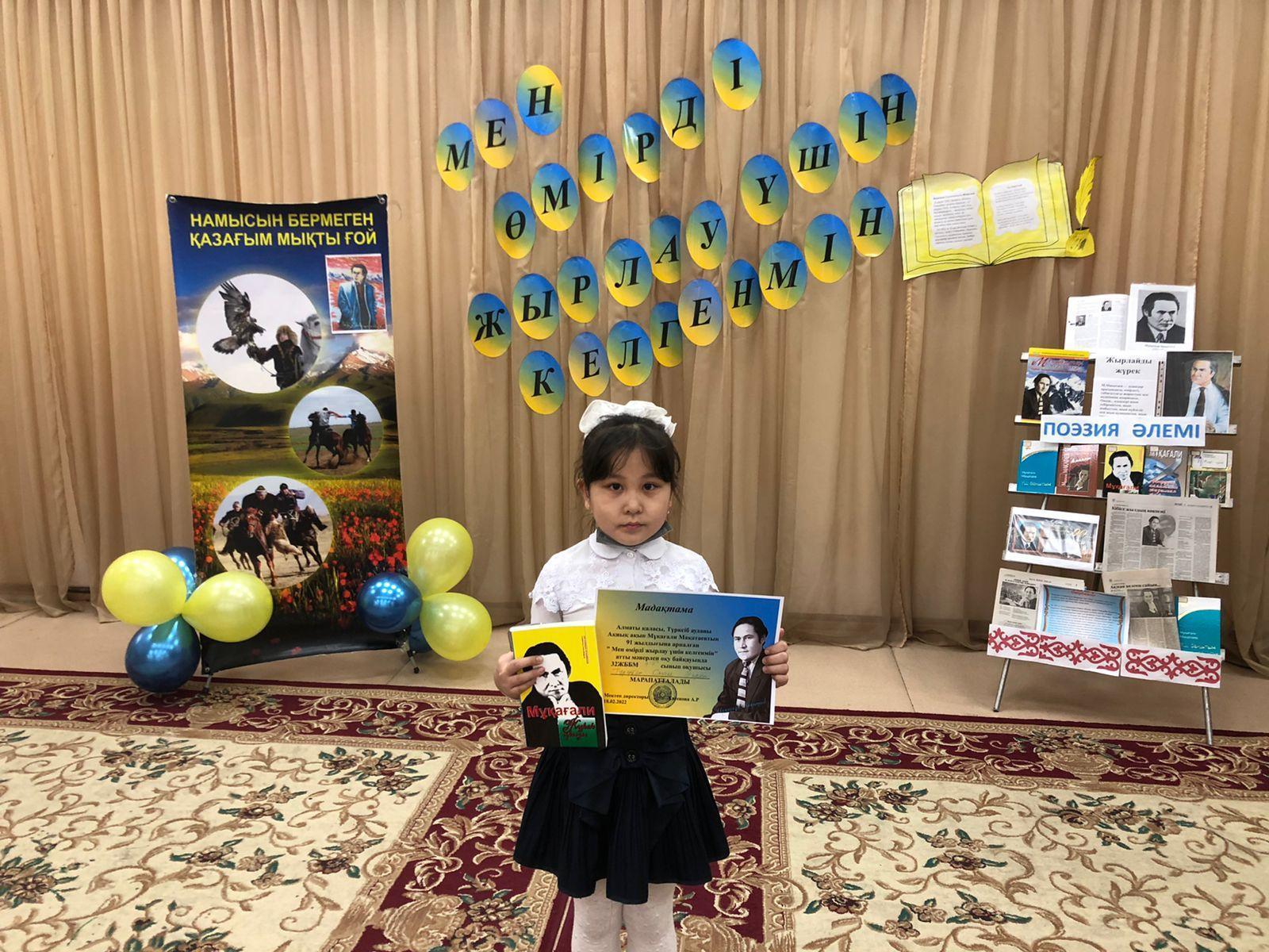 Бүгін 18.02.2022 ж бастауыш сыныптар арасында «Мен өмірді жырлау үшін келгенмін» атты мәнерлеп оқу сайысы өтті. Сайыстың мақсаты: Ақиық ақын Мұқағали Мақатаевтың өмірі мен шығармашылығын таныту, ақындық талантын шәкірт жүрегіне ұялату, поэзияға деген қызығушылығын арттыру, өлеңдерін мәнерлеп оқуға дағдыландыру, өлеңдерінің тәрбиелік мәнін түсіндіру. Оқушылардың өлеңге деген ынтасын, көркем сөз оқу шеберлігін арттыру, ізденімпаздық қасиеттерін қалыптастыру, Отанды сүюге, адамгершілікке, өлеңді, өнерді, сезімді бағалауға тәрбиелеу.