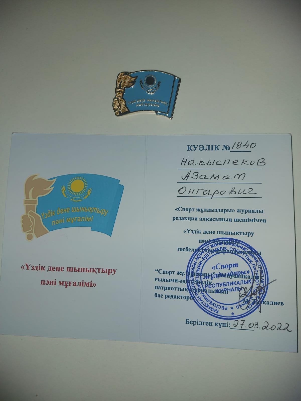 "Спорт жұлдыздары"журналының үстаздар арасында республикалық турнир женімпазы №32 ЖББМ КММ дене шыныктыру пәнінің мұғалімі Накыспеков Азамат Онгарович "Үздік дене шынықтыру пәні мұғалімі " атты төсбелгімен марапатталды.