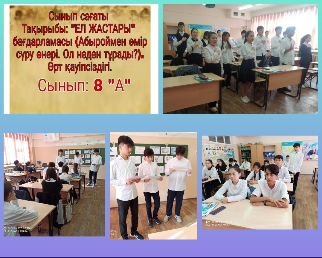 26 сәуір 2022 0 1 2 3 4 5 Ел жастары бағдарламасының тақырыптық сынып сағаттары/Тематические классные часы по "Ел жастары" Бүгін 1 сабақта "Ел жастары" бағдарламасы бойынша сынып сағаттары өтті.Сегодня 1 уроком прошли классные часы по программе "Ел жастары".