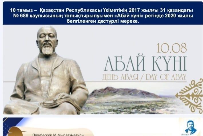Сегодня, 10 августа, в Казахстане отмечается День Абая – великого казахского поэта, мыслителя. День рождения великого казахского поэта Абая (10 августа 1845 года) официально стал праздничной датой в Казахстане в соответствии с Постановлением Правительства Республики Казахстан от 4 августа 2020 года.