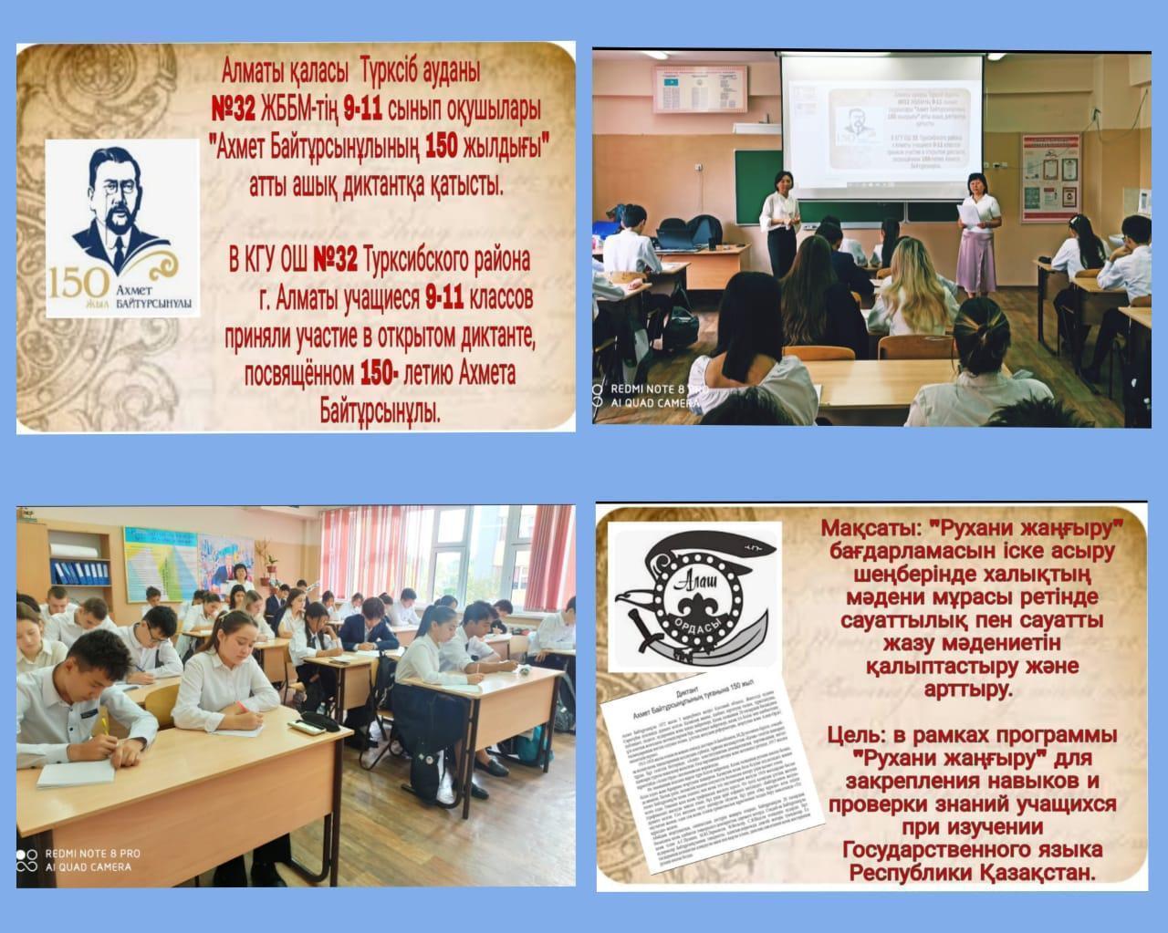 11 В сынып жетекшісі Динара Төлегенқызы және 9 А сынып жетекшесі Жанара Манарбекқызы Ахмет Байтұрсынұлының 150 жылдығына арналған ашық диктант өткізді.