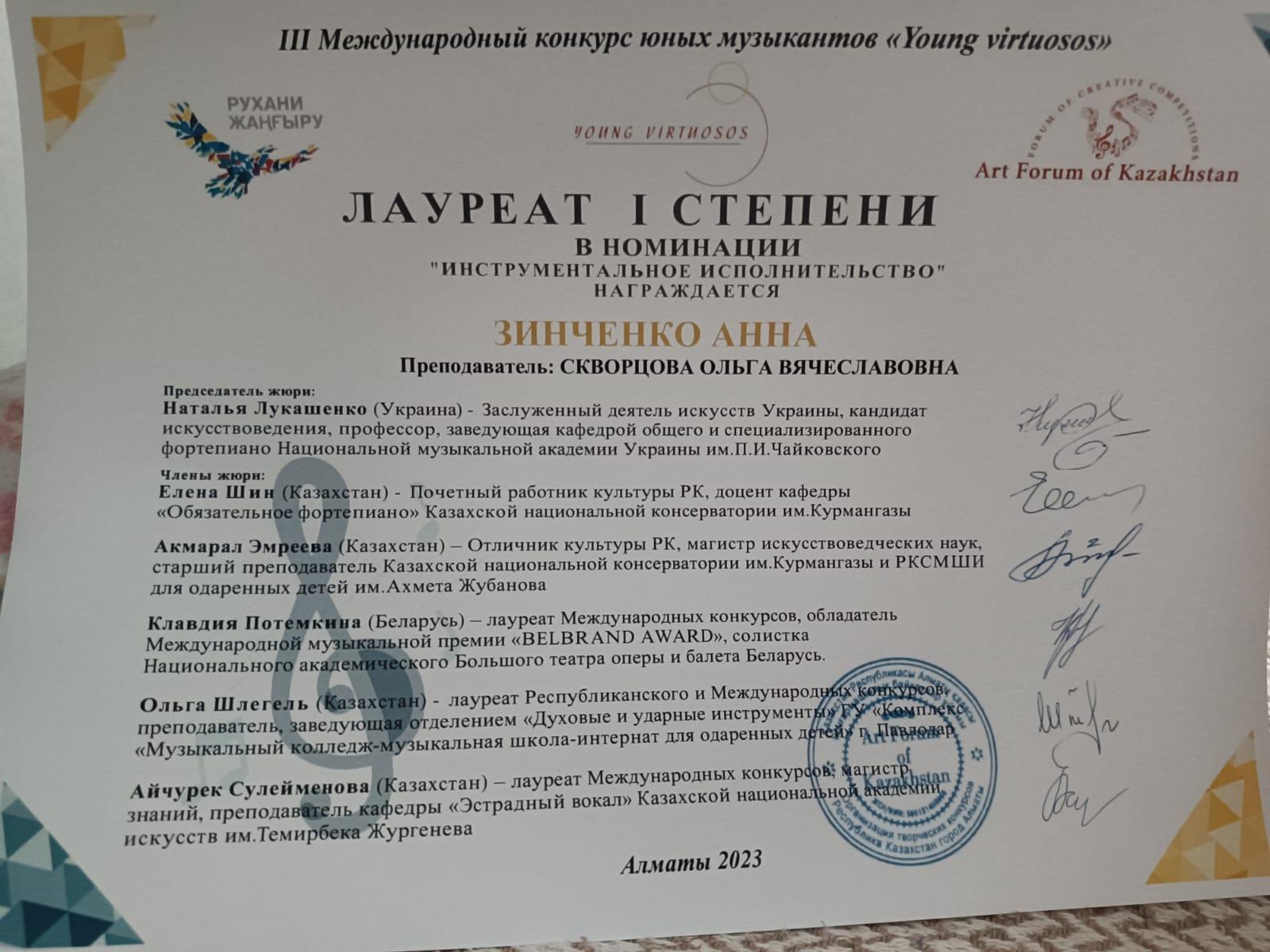 № 32 ЖББМ тің 8Д сынып оқушысы Зинченко Анна, Халықаралық жас музыканттар байқауында 1 орын, Фаст Екатерина ІІІ орынды иеленді. Ученицы КГУ "ОШ 32" Зинченко Анна заняла 1 место ,Фаст Екатерина 3 место в международном конкурсе юных музыкантов.