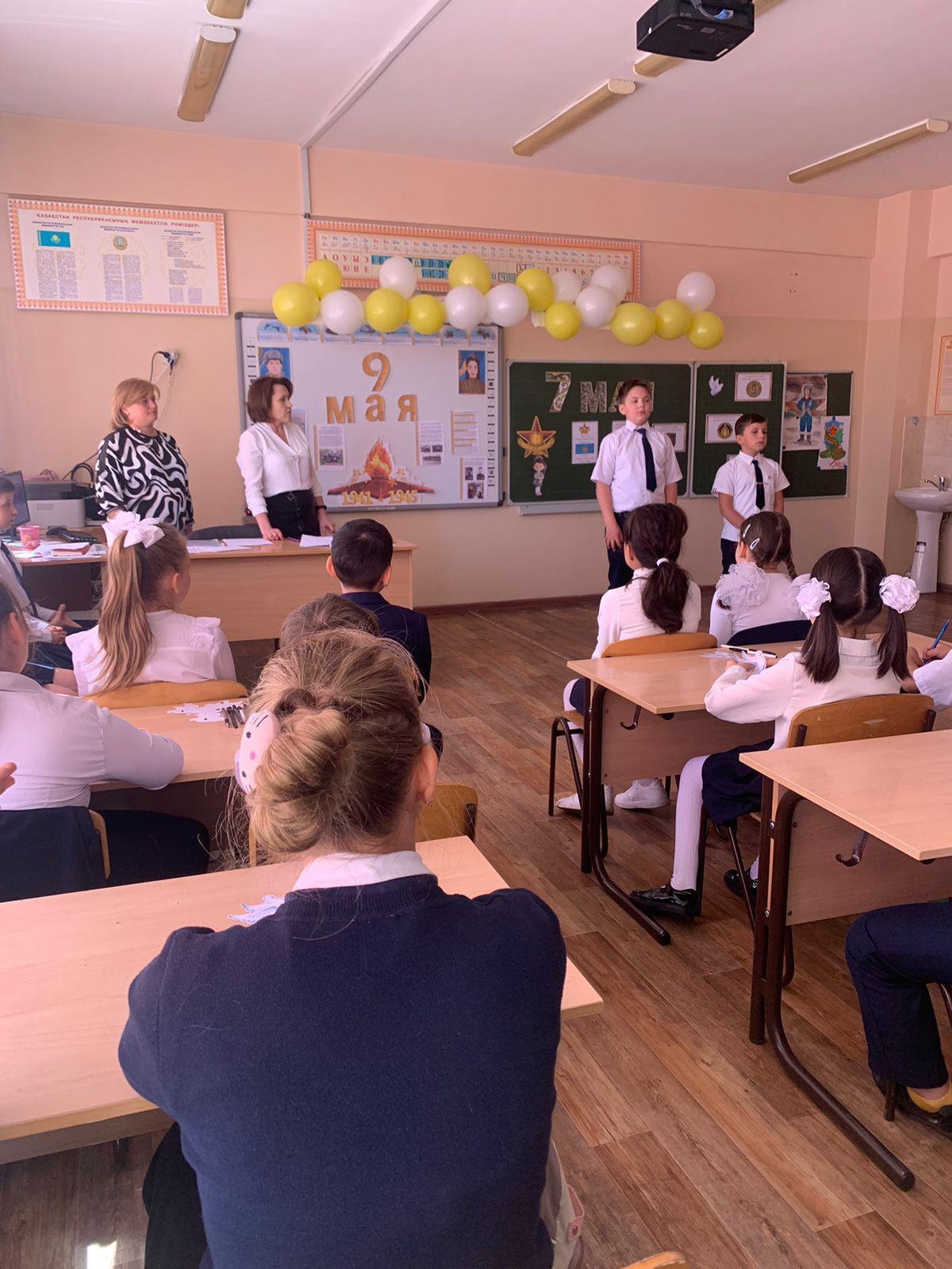 5 мамырда бастауыш сынып мұғалімдері С. А. Кисилева мен Н.А.Морозова 3 Б,Е және 4 е сыныптармен 9 мамыр мейрамына ашық сынып сағатын өткізді. Мақсаты: білім алушылардың патриоттық сезімдерін тәрбиелеу үшін жағдай жасау. Міндеттері: 1941-1945 жылдардағы Ұлы Отан соғысы жылдарындағы еліміздің тарихымен танысуды бастау;сөйлеуді дамытуға, оқылған өлеңдердің мағынасын мәнерлеп жеткізе білуге ықпал ету.Отанымыз үшін мақтаныш сезімін тәрбиелеуге, оны қиын уақытта қорғауға дайын, патриоттық сезімін оятуға ықпал ету. Бастауыш сынып оқушыларында Ұлы Отан соғысындағы Жеңістің маңыздылығын, соғыстан және соғыстан кейінгі қиын жылдардан аман қалған адамдарға алғыс білдіру қабілетін тәрбиелеу.