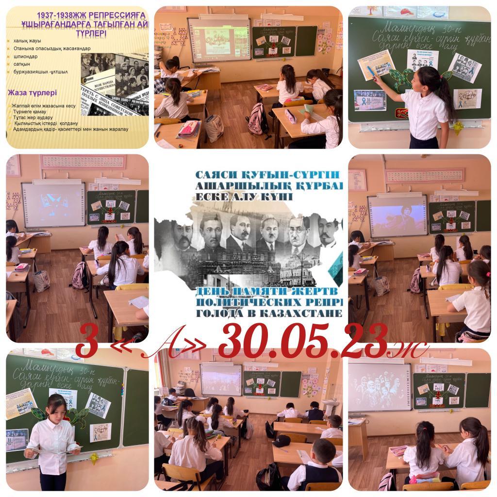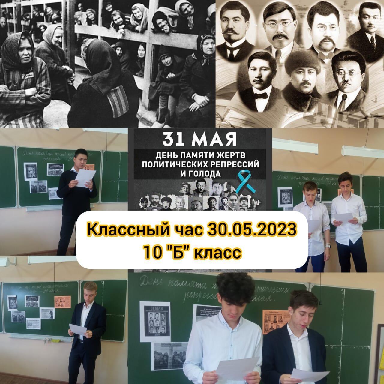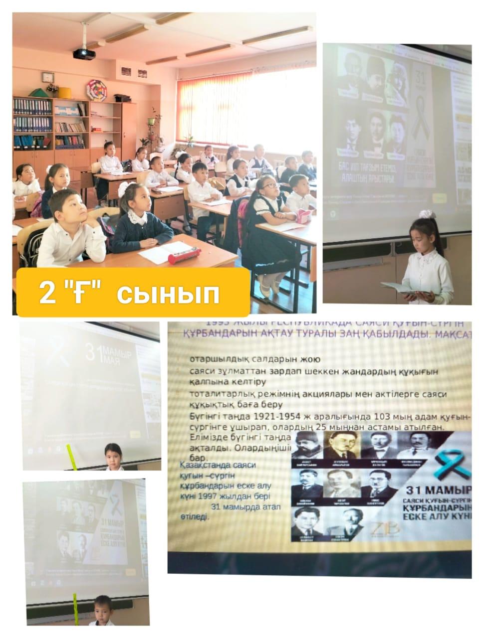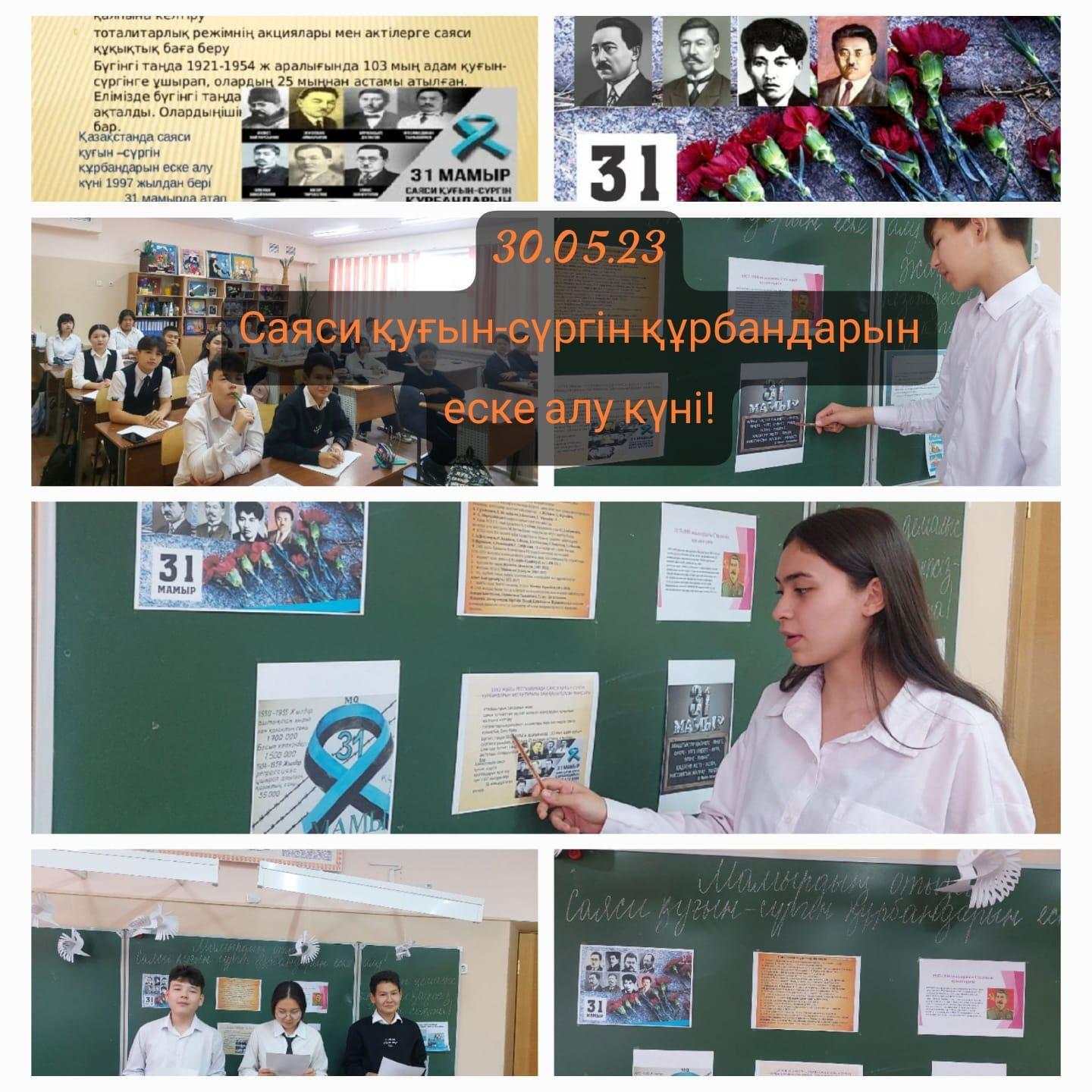 1997 жылы 5 сәуірде Елбасы 31 мамырды Саяси қуғын-сүргін құрбандарын еске алу күні деп белгілеу туралы Жарлыққа қол қойды. № 32 ЖББМ 1-11 сынып оқушылары арасында саяси қуғын-сүргін құрбандарын еске алу күніне арналған сынып сағаты өтті. Мақсаты: оқушыларды Отанымыздың тарихи өткенімен таныстыру, оқушыларды демократия, бостандық, жеке қадір-қасиет, адам құқықтары мен бостандықтарын құрметтеу рухында тәрбиелеу.Қазақстанда жыл сайын 31 мамыр Саяси қуғын-сүргін және ашаршылық құрбандарын еске алу күні ретінде атап өтіледі. Бұл қайғылы күн біздің ел тарихындағы ең қайғылы беттердің бірін білдіреді.