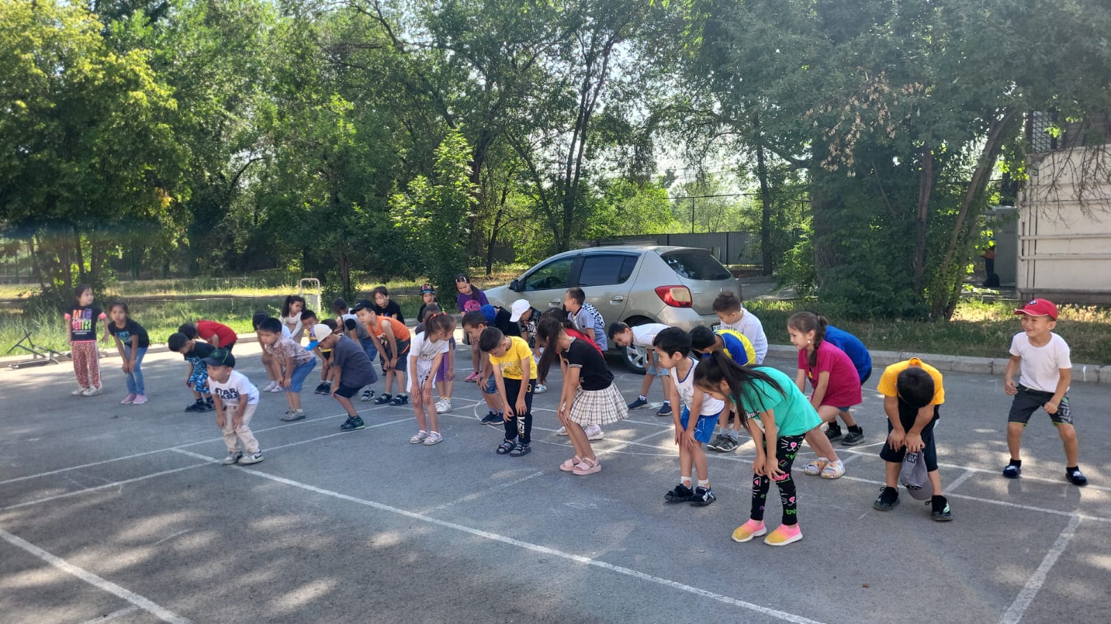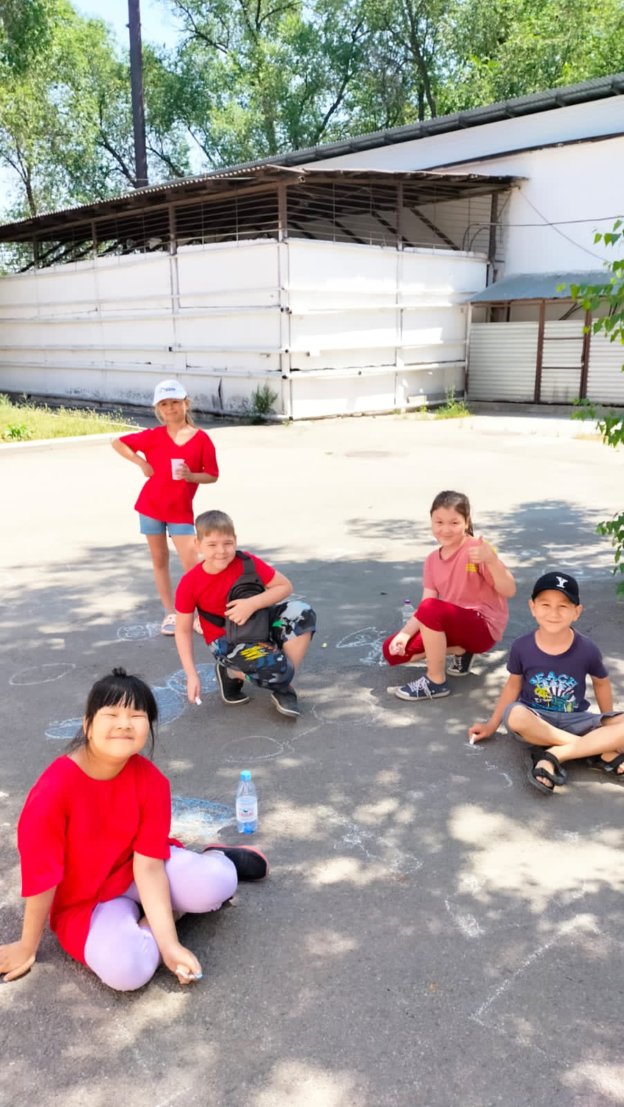Шестой день лагеря "Балдаурен". После утренней зарядки дети пошли на прогулку во двор школы и рисовали на асфальте. Затем дети делали поделки из разных материалов.