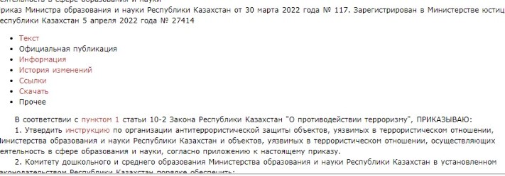 Терроризмге қарсы қорғауды ұйымдастыру жөніндегі нұсқаулық/инструкции по организации антитеррористической защиты объектов, уязвимых в террористическом отношении,